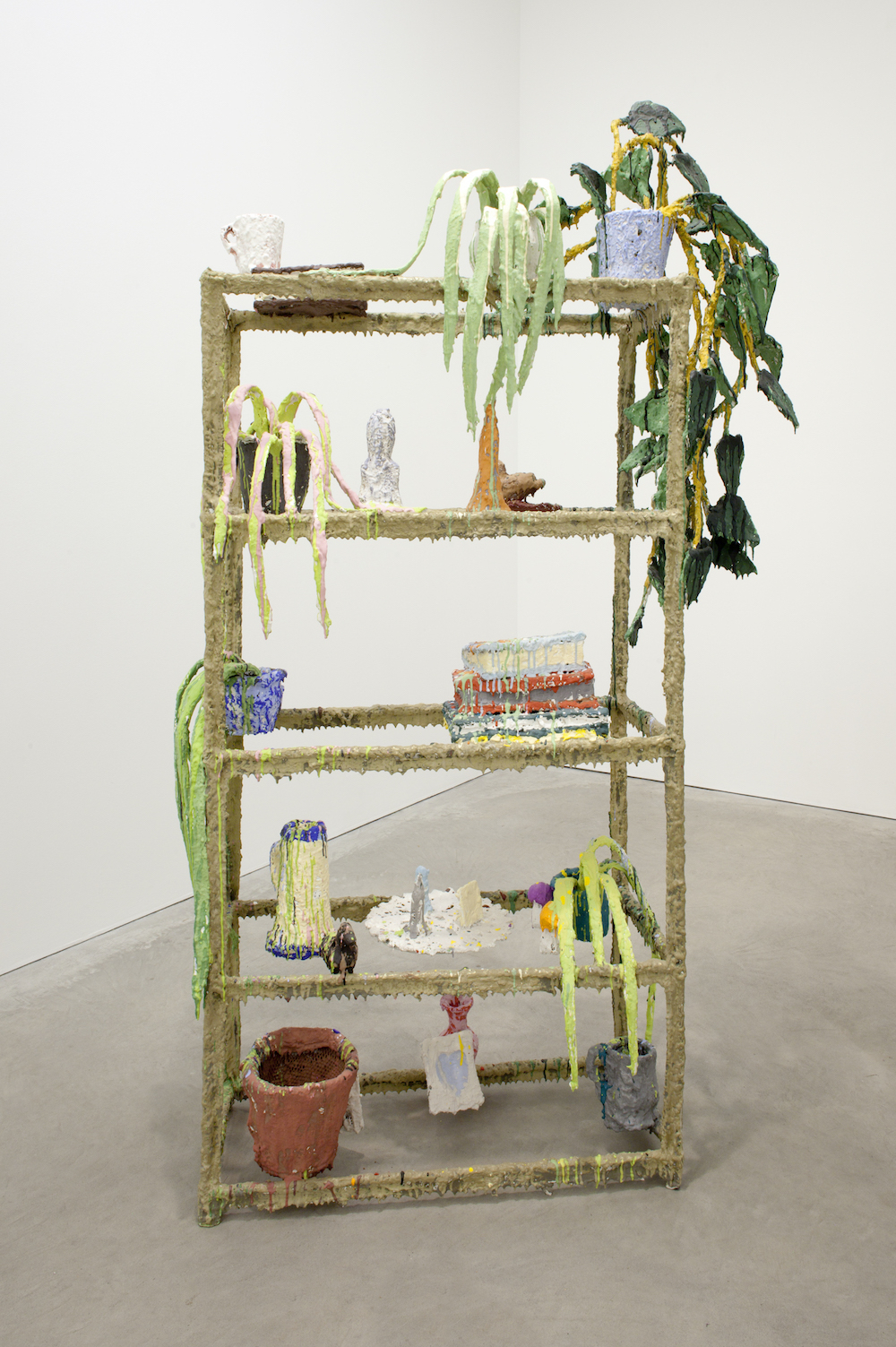 Weppler and Mahovsky’s genre might be called the still-life of disorder, even as their chosen objects – a desk, clipboards, and a shelving unit – are intended, in the world outside the exhibition, to combat this condition. Their objects accumulate even where accumulation should be impossible. The Known Universe (2017) is a shelving unit lacking shelves and to which its objects: book, house plants, a tea cup, a pitcher, and a dog figurine among them, cling in place to the shelving unit’s frame so that at first we do not notice the lack of a proper support. Everything, shelving unit included, is unified beneath accumulated drips of paint like an extravagant, chalky running-glaze in a cartoon of Japanese pottery.
