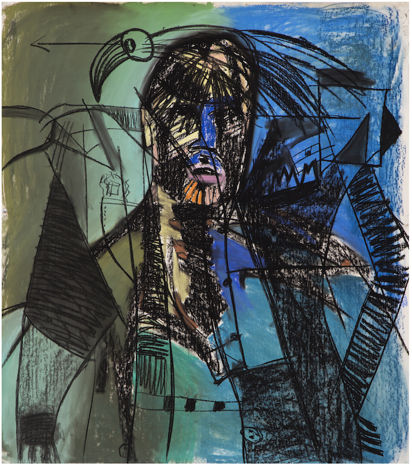 The thing about jaundice is that it’s markedly visible. It indicates something’s wrong, maybe really wrong, but doesn’t immediately offer much information as to the underlying causes. We might see a yellowing of the eyes or a tingeing of the skin, as in the nine pastel and charcoal drawings on paper that, along with a short video, round out Clottey’s show. The sketchy drawings depart from the monochrome palette of his previous charcoals and largely depict voluptuous nudes. Women’s heads are either cut off or radically shrunken in a manner that suggests amputation; in one drawing, three sets of limbs entangle and overlap as if caught mid-ménage. The few men meanwhile appear as angular, elongated forms with planar, wood carving-like heads, which recur in the statuesque masks of the video. They are powerfully built, with insistent traps, defined pecs, and abs like fresh sutures. In their disjointed forms they might read as proto-Cubist, except that that movement itself turned on repurposing African sculptural forms. The titles hint at humor: the aforementioned trio of Volunteers Abroad (all works 2017) to skewer the psychosexual romp of the NGO-industrial complex, while in In Today’s Economy, a figure slumps with a half-empty bottle.