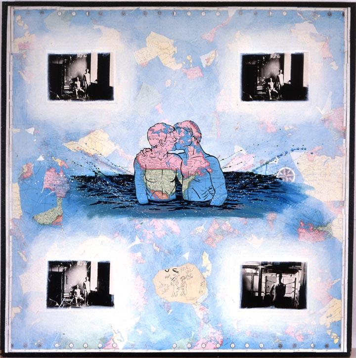 The technique finally works to enormous effect in Fuck You, Faggot Fucker (1984): on top of the deep blue oceans of a rearranged map of the world, Wojnarowicz painted an outline of two faceless men, locked in a deep kiss, their shirtless torsos rising from a flowing body of painted water. In each of the painting’s four corners, the artist set a homoerotic black-and-white photo of himself and a male friend, shirtless, taken while exploring an abandoned building. In the lower center of the image sits a collaged fragment of a drawing he found on the street that contains the work’s eponymous insult. A map of the USA, part of the background, appears across the chests of the stenciled lovers, as if projected upon them, or found by X-ray inside, suggesting that the homophobia of the state, like that found in the street, is a force acting upon their love, from within and without. Yet their love makes them as fluid and free as water, the oceans that comprise so much, and which belong to no country. The piece’s emotional power lies in its juxtaposition of images: a sensual sense of all of history and the future collapsing cinematically into a single instance – this kiss. It is a pivotal work. The young artist – perhaps for the first time in his career – captures the great subject of his life’s work: the interiority of the marginalized queer or criminal trapped within their times, set against millenarian intuitions of entropy and fading empire.