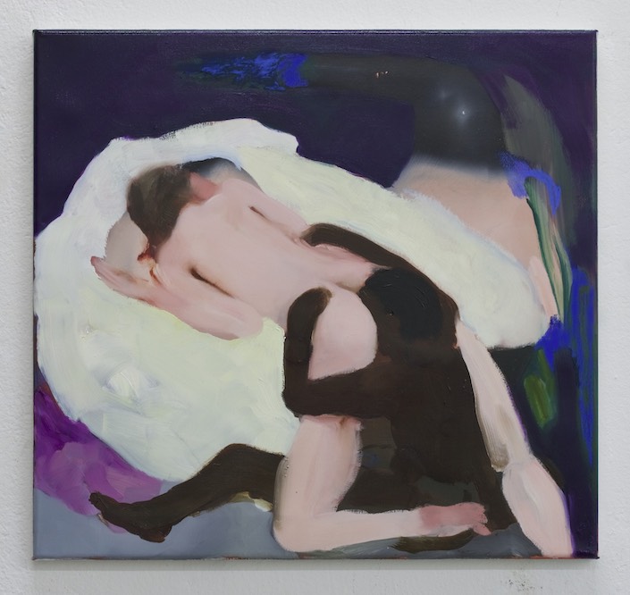 I first observed the uncanny paintings of Ambera Wellmann in an intimate solo show at Toronto’s now-defunct Richard Rhodes Dupont Projects. A natural light flooded in and complicated the paintings’ surfaces, which themselves imagined a porcelain glint – a polished skin both lambent and scattering. Amorphous shapes and boneless bodies populated those cryptic canvases, which shimmered with details like delicate Renaissance hands, flashing animal eyes; curious, moving, nighttime forms; translucent, white-blue skin shifting under shadow, or stilled by historicizing light. Wellmann’s first professional outing rippled with its own pleasure while endowing movement and melancholy to the difficulty of mortal objects. They appeared caught in the act of becoming – which felt fitting for a recent graduate’s first work. Wellmann, like her restless nocturnal subjects, seemed to be at once nervous, ambitious, and caught surprised by our look.