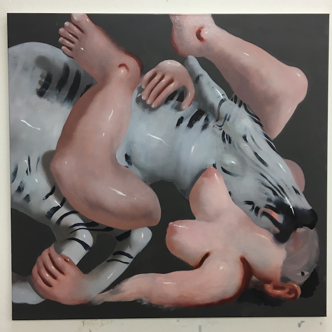 My work changed like crazy in the past year. And that was extremely liberating. Because I would toil over a painting for three months at a time, at Guelph, and there was no pleasure in that. It killed me. I love those paintings I made during the two years of my degree, but I started to feel like they became tighter and more controlled and suppressed. There’s a sense of repression in the porcelain works specifically. There would be a loose, wild moment at the end; a spontaneous decision that made all the suffering worthwhile. But spending 3-4 months on a painting is hell, it’s hell. I wanted to confront subject matter more directly, and tackle more explicit subject matter, rather than suppressing or containing it. So the work became more explicitly erotic.