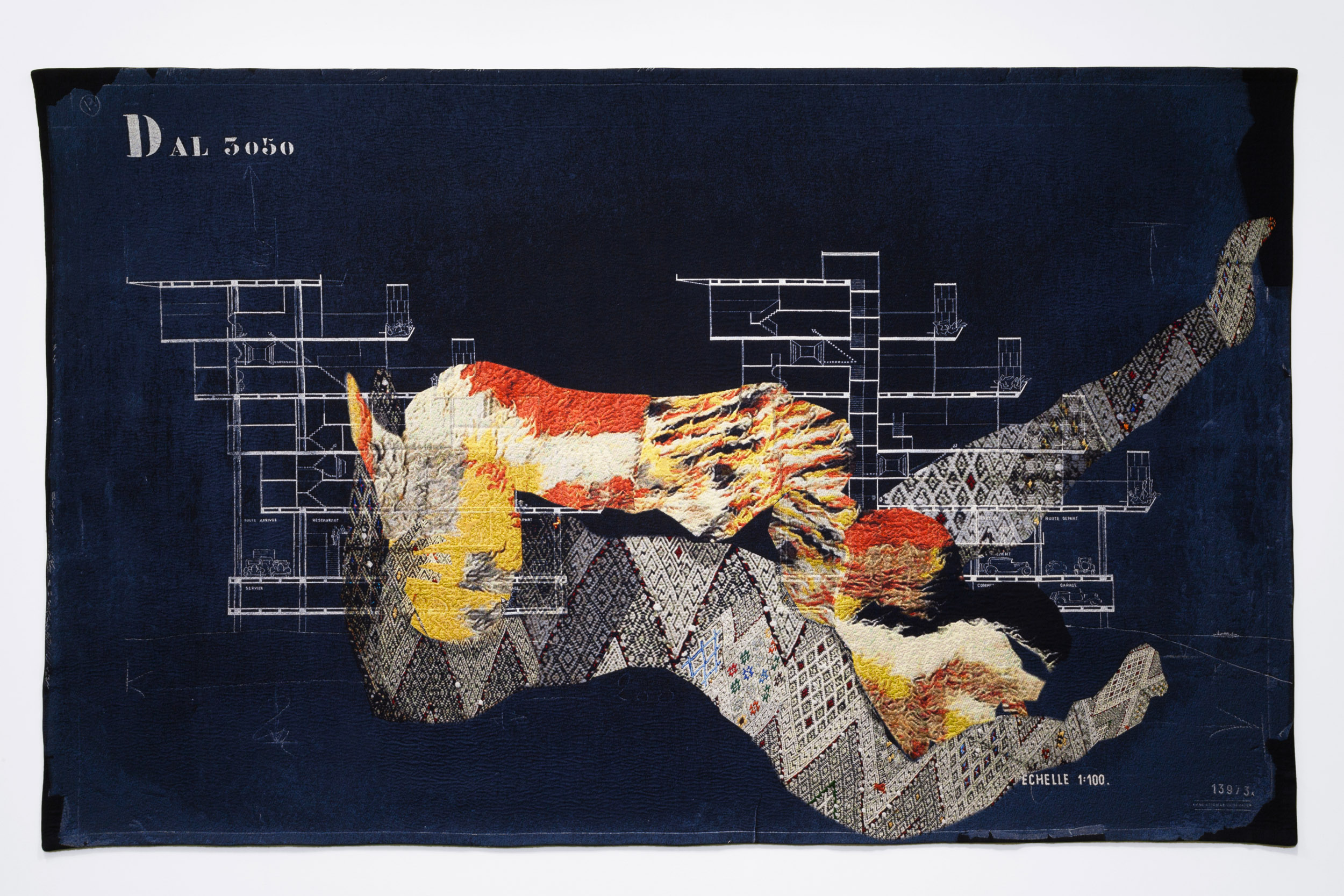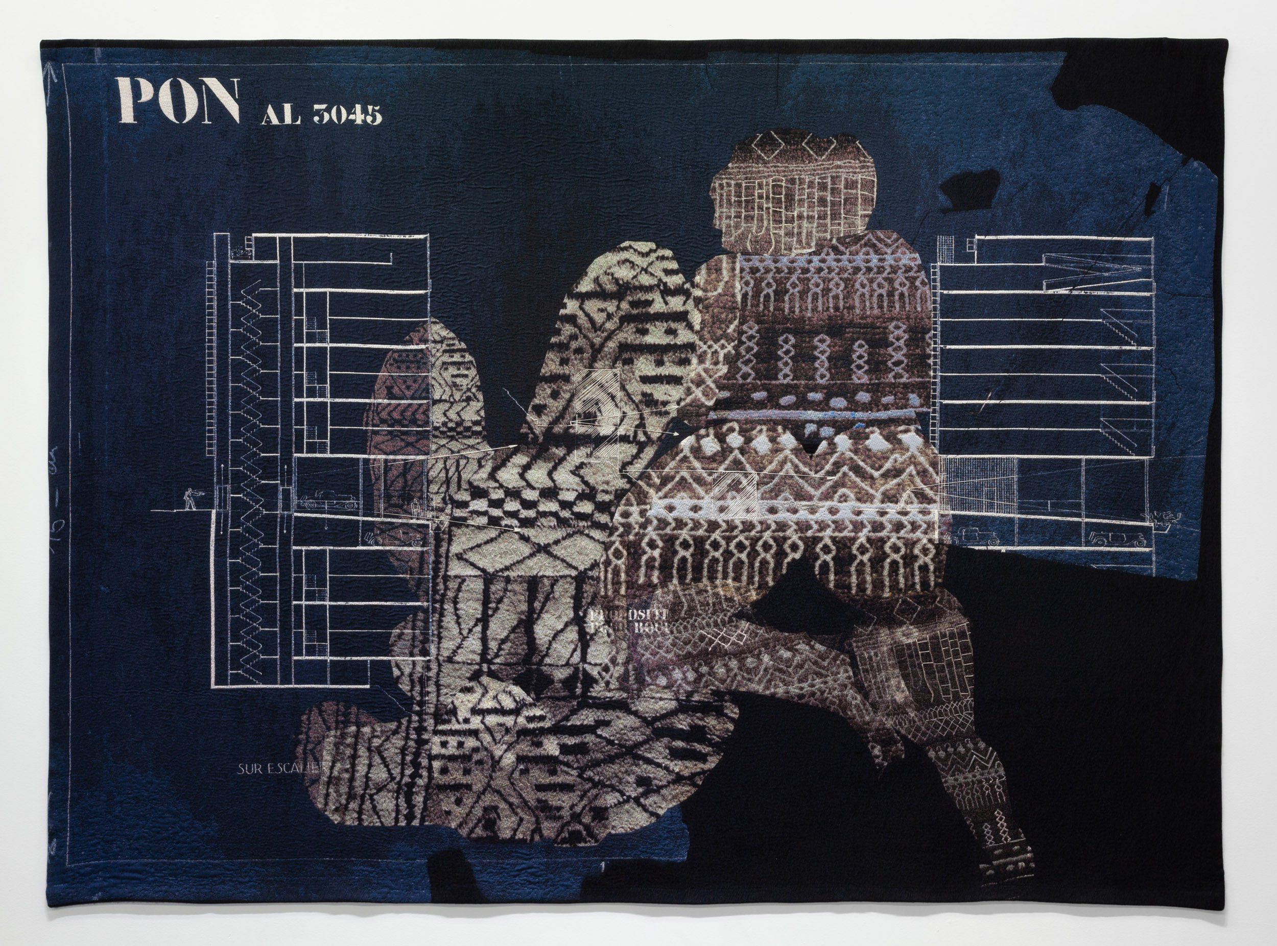 Continuing the artist’s material leitmotif of producing large tapestries, Oued Ouchaia and Maison Locative Ponsik (all works 2018) superimpose Le Corbusier’s “best-laid plans” with splayed limbs, featuring the women who backgrounded his colonial ambitions. Tumid, towering, and freed from their odalisque to overwhelm a drafted city, Bool foregrounds the muse while underscoring her fantasy.