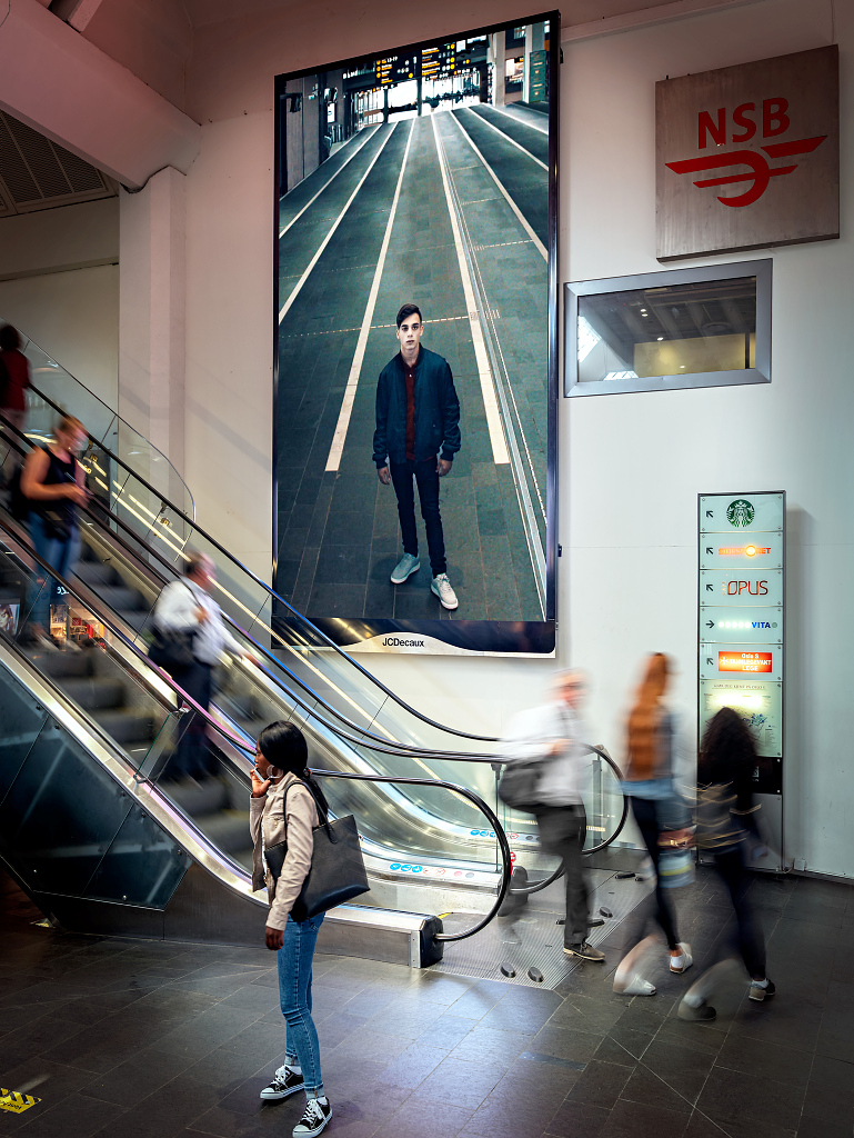 The heart of the exhibition comprises three thirty-second films that Eliassen made for display in Oslo Central Station this past summer. The films fuse Nazi-era film imagery with footage of a contemporary teenager, a spectator who appears to enter the 1930s film. Eliassen described the visual entanglement of the human with the cinematic scene as “cyborgian” – a concept that Leeson has explored since the 1960s. Each advertisement-length film was created for – and filmed in – a specific spot in the station. Inserted into a regular, commercial loop of major brand advertisements for seven days, Eliassen’s films were screened 67,000 times and seen by 150,000 visitors per day.