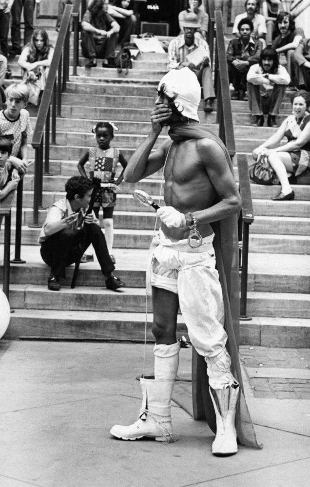 Also known as “Lemon Boy” because of his tendency to demarcate the boundaries of his street performances with lemons, Gallo maintained no separation between his art and life. Whether walking around downtown, making an appearance at Max’s Kansas City, performing on the sidewalks in front of luxury stores on Fifth Avenue, or lounging in his apartment, Gallo’s signature outfits were immediately recognizable. The outfits were alternately pieced together from store-bought articles or made specifically for Gallo, most frequently by the designers Ronald Kolodzie and Phillip Haight. Gallo’s aesthetic was characterized by queer, overtly sexual, hyper-masculine camp, sort of like Tom of Finland goes to Studio 54.