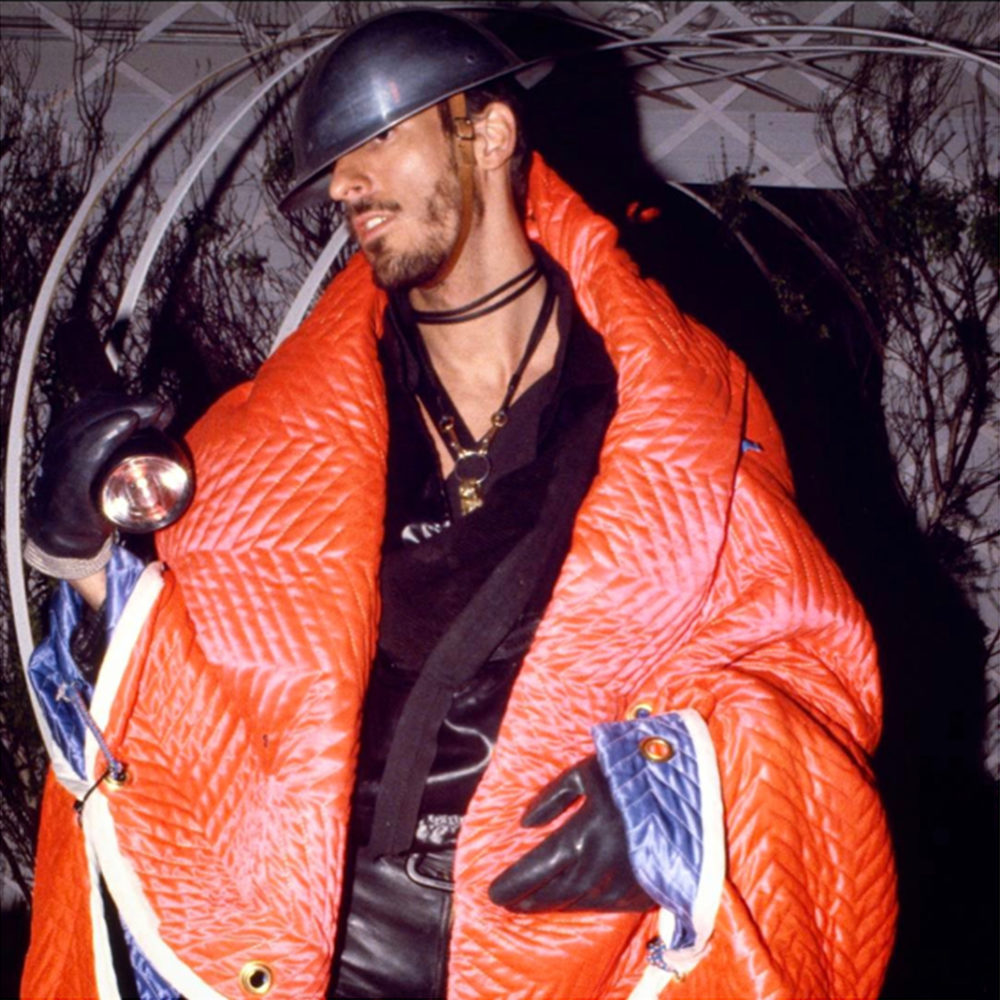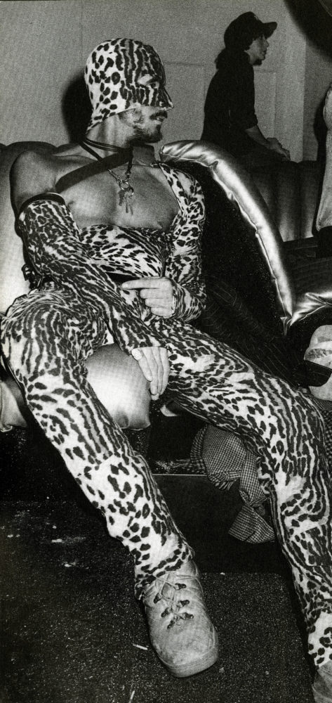 Gallo’s outfits frequently subverted masculine fetish tropes by including femme-forward elements like fishnets, heels, garish animal prints, and dramatic, sweeping capes. Drawing from various points across the spectrum of gender expression, Gallo’s outfits often echoed the androgynous tendencies of early ’70s glam rock style. The critical difference, however, is that glam rock existed primarily on the stage, and Gallo saw no distinction between performance and the rest of his life.