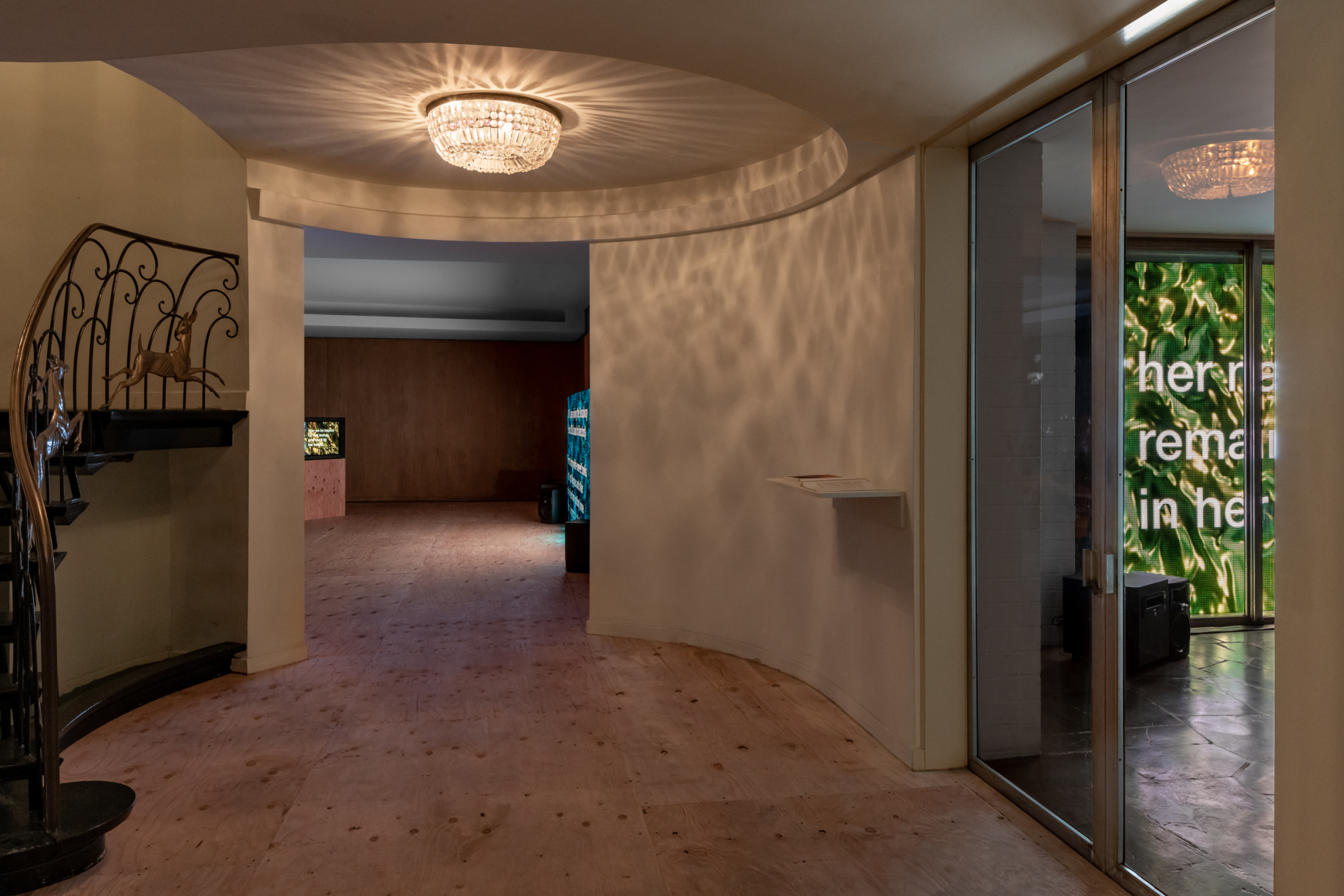 Williams’s legacy has already been victim to such unconscious prejudice, like when the director of the prestigious Harvard Westlake school proposed moving a Williams house from the still-exclusive, very white Holmby Hills to La Canada Flintridge, 38 miles east. “We can relocate the house to another neighborhood where he also might not have been able to live,” the director said in 2005. Cokes’s Della’s House tries to avoid such easy elisions, though it is his work in the dining room, not sourced from biography at all, that resonates best with its context. His 1990 Fade to Black plays on a monitor installed on a wall still adorned with a mural of branches and blossoms. The tall mirror on the elegant built-in buffet against the opposite wall reflects the video back. Images from unquestionably racist Hollywood features, some made by and with the kind of people Williams elaborately housed, float in the center of the screen, while titles of other racist films appear above while a searching narrative runs beneath: “but this recognition is always already a mistaken identity.” Sometimes words, bright against all-black, fill the screen: “I don’t understand what’s going on.” An audio collage of music and male voices discussing casual racism complicates the work, which strips bare, but offers no solution to, the kind of volitional, criminal mainstream obliviousness that still sidelines Paul Williams’s legacy.