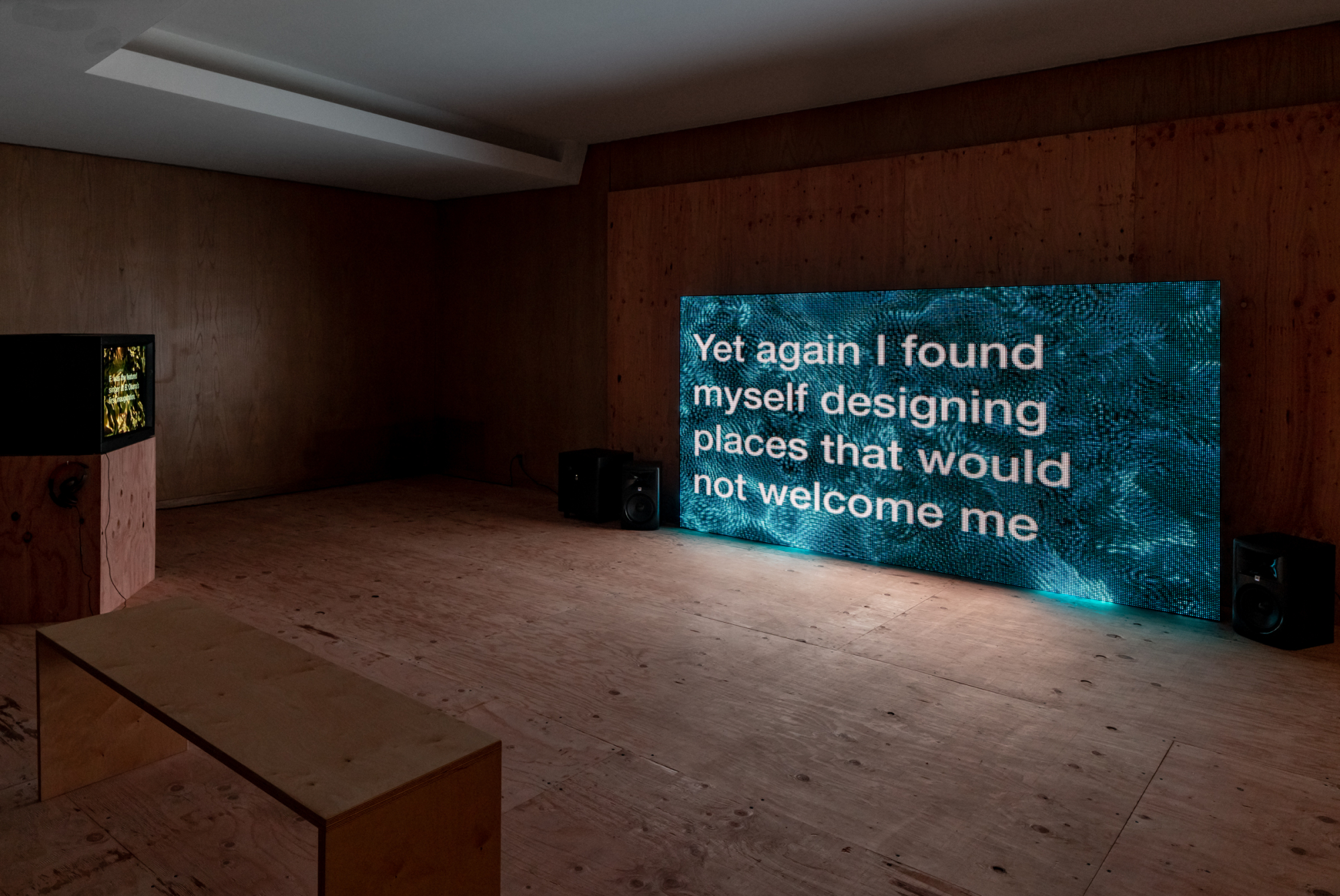 Hudson owned the house until she sold it last year, making Hannah Hoffman Gallery the first non-Williams-family resident. Hudson also wrote the only two Williams monographs, and the 1994 book, The Will & the Way, from which Cokes borrowed material for this exhibition. A children’s book, The Will & the Way is a fictionalized, but historically-accurate, biography written in Williams’s voice. Most of the architect’s papers, stored at the Broadway Savings & Loans that he designed, burned during the Rodney King protests, a fact that makes creative retellings like Hudson’s particularly helpful. You wouldn’t likely know, however, from watching Cokes’s videos – or reading the restrained press release – that Hudson, rather than Williams, is the artist’s primary source (though Cokes does include citations at the end of each video). In Williams’s former living room, large white sans-serif text floats against an undulated, digital blue ocean: “I would ask if they entertained at home or in a hotel.” This is Hudson-as-Williams on how to make rich whites comfortable. “I could not forget that I was not accepted the way other architects were.” Nearer the sleek marble fireplace plays another video, The Queen is Dead…Fragment 2 (2019), this one a tribute to Aretha Franklin. Text from New Yorker editor-in-chief David Remnick’s 2016 tribute to the Queen of Soul plays against a backdrop that resembles shifting, shimmery gold wrapping paper, as Franklin sings.