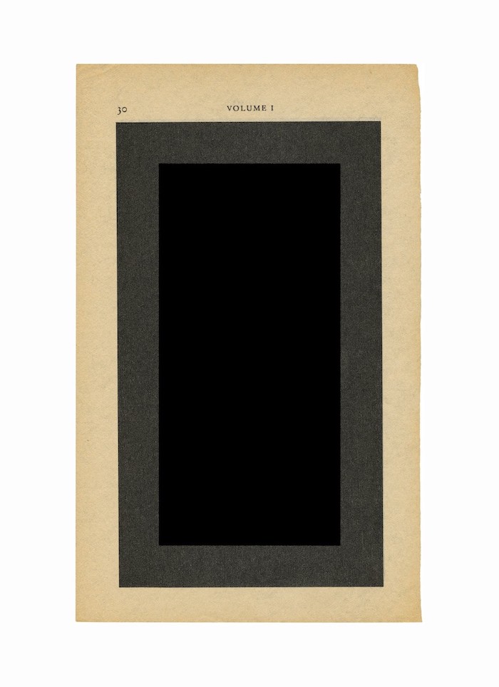 For this exhibition, titled Lacuna (Alas Poor Yorick!), Henricks sought out copies of Laurence Sterne’s novel Tristram Shandy (1759). The book, a farcical faux-autobiography and early experimental novel, is known for its formal play. After the woeful death of a character, Parson Yorick, Sterne presents us with a page covered in black ink on both sides. The significance of the black page has long been the subject of debate for dissertation-writers, but the exhibition’s text describes a key aspect of its ambiguity: “On one hand, the black page can be understood as an overflowing of ink and emotion representing inexpressible grief. On the other hand, it is like an image of an open grave: an opening, an absence, a void.” Henricks’s rumination on this black page emphasizes the density, the nested complexity, of representations of loss.