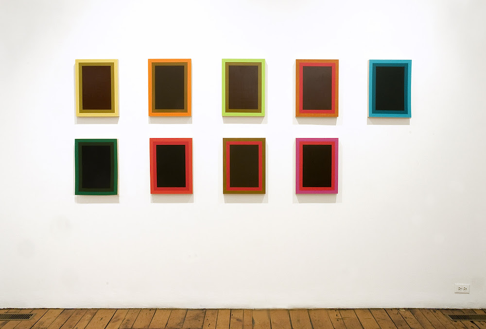 Henricks then mixed this ash into oil and acrylic media and created the centerpiece that so halted me: a series of differentially ashen blacks, a gradient of texture, shade, and void, varieties of compound loss and attempted recovery. As refrain, Henricks made another series of painted black pages, but with colorful borders. The color along the edges of these works comes from paint that belonged to his recently deceased mother, a landscape artist. The series will continue until her paint has been used up.