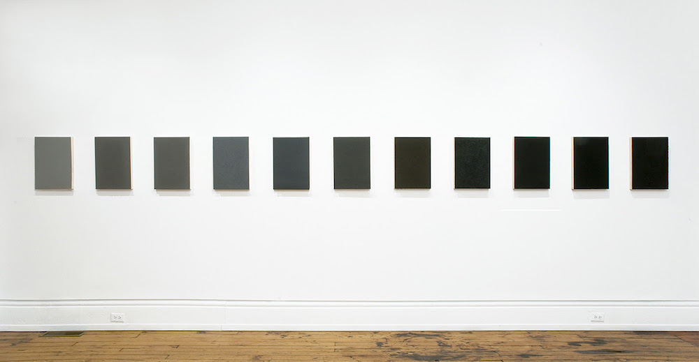 In the course of my grieving, I lost my capacity to represent my grief to others. There were no useful tools to properly describe the extent of my immersion in a colorless fog. On the day Nelson Henricks’s exhibition closes, I will have had four years to familiarize myself with the way that grey is composed, inexactly and iteratively, of some basic, unalterable fact. And so, I could not seem to remain for long in front of a row of eleven greyscale variations in paint; they formed a gradient, from lightest to darkest, but called up the same void. Together, the paintings make a convincing case for mourning as a particular synesthesia, whose experience I’ll call ashen black.
