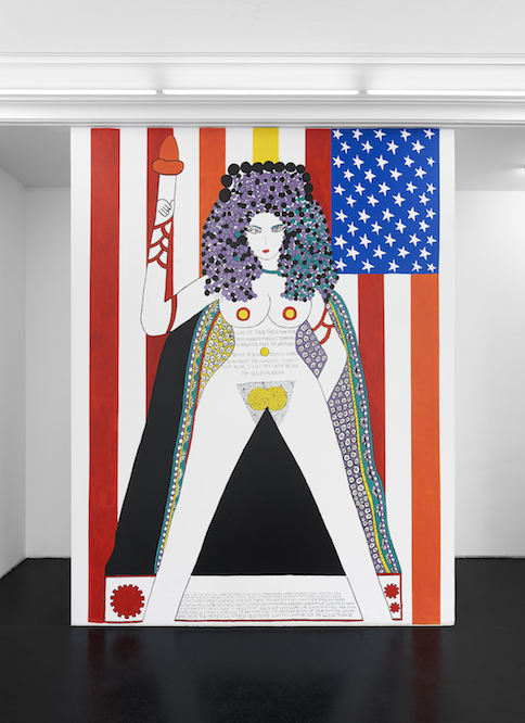 For decades, Iannone has busily constructed a libidinal, cosmic realm. At Peres Projects, we are deliverd there by an immense Lady Liberty wall painting. She stands within an ornamented cape, hair like bushelled grapes, nipples glowing orange. Behind her is a rainbow-hued American flag. Scrawled on her stomach is the Statue of Liberty’s famous – and no longer so believable – invitation to hungry and huddled masses. Nearby, Mr. and Mrs. Liberty are rendered carnivalesque, as free-standing plywood cut-outs. Both are flat white – conspicuously, for a show tied to American immigration. Lady Liberty holds a starburst flame and a writing tablet. The torch’s yellow is echoed in sprinkled stars and flowers, and cameos of pink and red. Lord Liberty’s blue and red stars are more familiar. He holds a bird, which kisses a red sun, and his tablet reads “United we stand / Divided we fall,” an apt though cloying match to her “The people united will never be defeated!” His raging hard-on and her coy smile proudly hail one another.