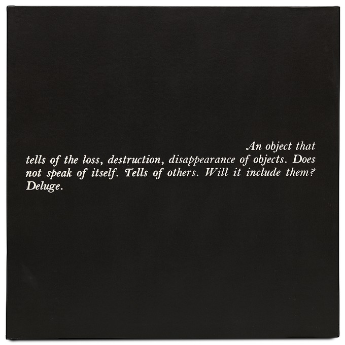 Vittorio Sereni, the postwar Italian poet who has meant so much to me, once praised another poet’s writing as free of “any preconstituted understanding. In you,” he continued, “understanding is an outcome.” That seems a workable way of recognizing beauty: that meaning gathers, is always provisional, is always elusive. In a gallery one floor below the Anthropocene, I restored myself by studying an early painting of Joseph Kosuth’s. Black, an almost blank surface bore in white the text, “an object that tells of the loss, destruction, disappearance of objects. Does not speak of itself. Tells of others. Will it include them? Deluge.”