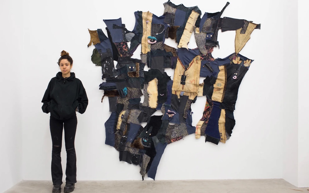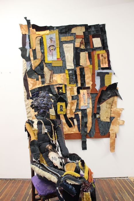 Invested in what she calls the “material DNA” of her fabrics, Lewis takes donations and scours the Salvation Army shops in whichever place she’s visiting to source her textiles. She works while on the road, between fairs and exhibitions, finding new swathes and quilting from her suitcase. The artist has long favored found objects (chains, paint cans, pipes, toys, hair, stones, copper, fabric, wires, acrylic paint, plaster), but recently she’s been particularly involved with fabric. In reviving discarded commodities, Lewis tells me, she transmutes their received histories and energies, and reveals the material’s provisional, labor-intensive nature as well as its evocations of the itinerant realities of the Black Diaspora. “So many of our cultural tools, especially against oppression, have to do with physical or situational upcycling,” she says, “[whether] of a circumstance or an idea or an object.”