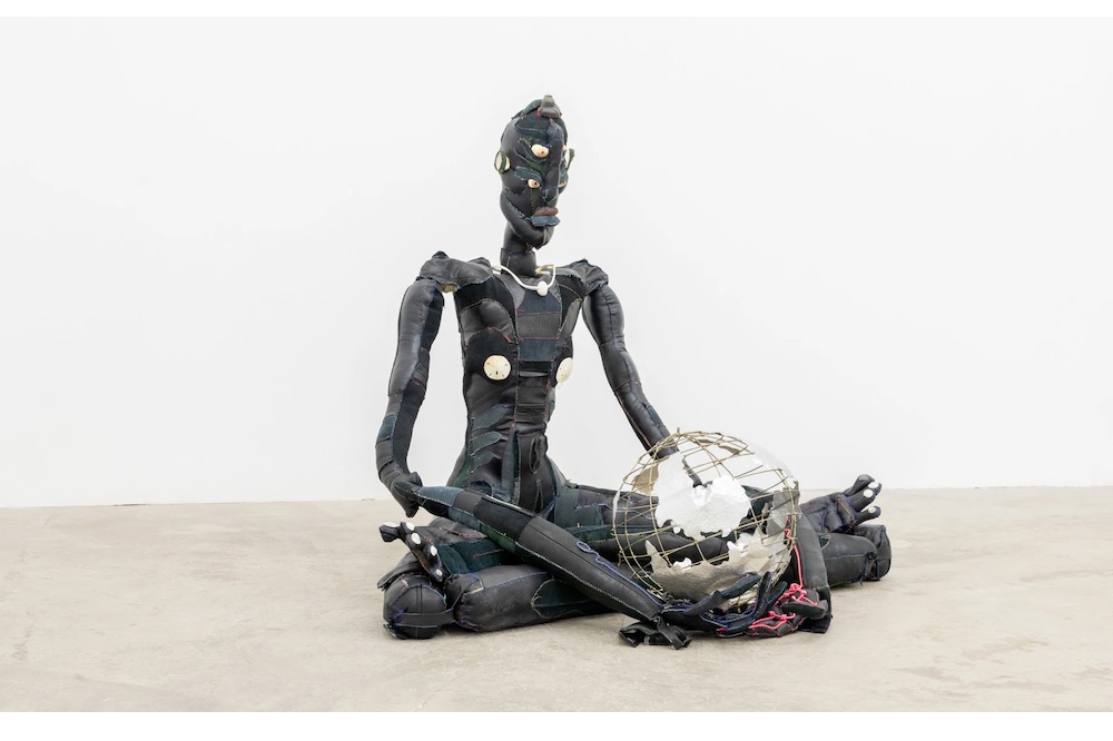 Over the course of a studio visit with Lewis on a hot September day, I observe her sit almost intimately near a sculpture central to her upcoming presentation in Art Basel Miami Beach (with Toronto gallery Cooper Cole). Harmony (2019) is long-limbed, spindly, and roughly sewn together—a spidery black figure in a posture of meditation, holding a threadbare, emptied-out globe. Her toenails are made of seashells that look like pale moons, as are her breasts. Her face carries several sets of eyes, and the darning of her black body suggests empathy and intensity, her stitching worked-over and hard-won. Harmony looks as if it has lived a very storied life.