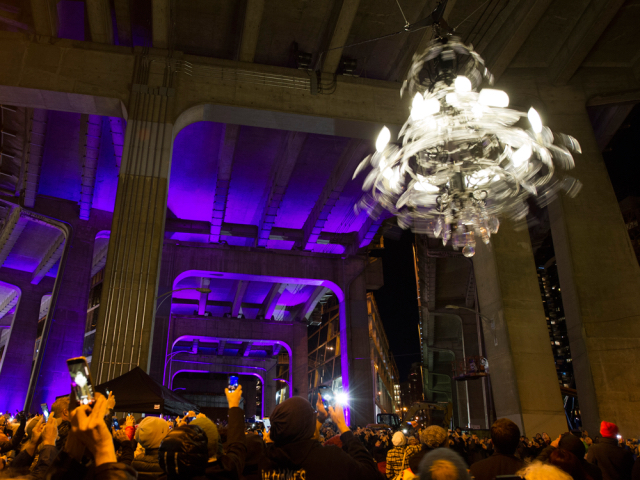 The under-bridge setting is as much part of the work as its over-fed rococo signification. This grimy—but not too grimy—locale lends the decoration an absurdist charm. It’s easy to imagine people who haven’t had to spend much time in such places chuckling over the contrast of whimsy and urban abjection. On a deeper level, the location provides the dark underlining for what this work really is: a self-serving in-joke about capitalist privilege. Spinning Chandelier was produced by Westbank Corporation, developer of luxury-housing complexes.