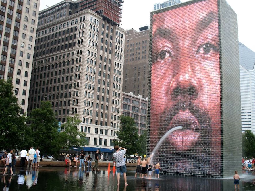 Public art was tactically employed to provide Chicago with a new identity as well as draw more people to the downtown core via the new park. One of the works commissioned is a water feature that includes a fifty-foot-tall video sculpture by the Spanish artist Jaume Plensa, in which huge heads of various people give the effect of spouting water from their puckered lips.