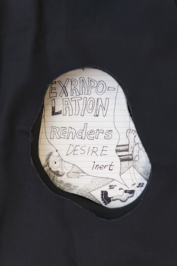 Another sculpture in the same show, Lying in Fiction, is a pair of black pants lying on a plinth, cheekily painted grey on the top and the “spine,” so that it appears as both a book and a bed. White feet clad in black slides melt down the edge of the platform like cartoon tongues. Several holes are cut out of the pants, exposing pages from Scott’s notebooks, scrawled with texts and drawings that feel like notes from an MFA seminar, clotted with opaque theoretical language (“explosive plasticity,” “extrapolation renders desire inert”), but also dotted with illuminating bits of process. The sculpture offers a figure for the invasiveness of art-making, in which audiences and artists probe the body for material, answers, and explanations, which remain mostly moot.