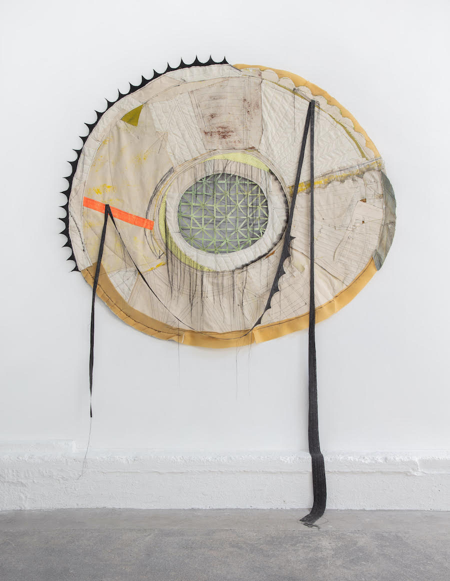 After the stay-at-home order lifted in New York City, the first show I visited was Jane South’s at Spencer Brownstone, a beautiful, meditative gallery that is among my favorites in the city. Something about the way South’s work interacted with the architecture made this commercial space feel more like a chamber or a vault, sunlight streaming in through the window facing the sculpture garden. This reflective effect belied the fact that South drew from the materials of her exploding living space, which her landlord has been renovating over the last few years to keep up with city codes and ordinances. South, who recently started working with an industrial sewing machine, mined the history of her building, feeding fabrics left by past tenants and roommates as well as her past artworks through the machine’s teeth. The resulting work has a certain home-schooled savant quality (reminiscent of Harmony Korine’s interest in the avant-garde aesthetic developed by home-schooled kids, their assemblage of contradictory images and symbols formed in opposition to their insular environment). The quilted materials in South’s work run into removed packing foam, and seams from old curtains abandoned by former roommates are left to hang. For instance Cutter (2019), an irregularly shaped wall-hanging assemblage, combines older works-on-paper by South with batting, curtains, and packing foam. Mark (2019) similarly combines drawings, batting, and fabric, though its circular shape makes it resemble the inside of a booster rocket—or more of an IBM mission control computer. The work seems to visibly be about material interchanges—such as thread and fabrics finding harmonies—and a materialism that supersedes any metonymic language. South’s exhibition felt like a deep codex, the result of a material hermeticism that only has room for the artist herself to occupy. These soft aesthetic machines appeared remote, the materials washed ashore from a great wreck, something owed to South’s shift in materials from the stable, architectural forms she had previously been making from wood. South has turned the sewing needle into a drawing device and has applied it to the excess materials abandoned in our rented spaces. She addresses the drift and precariousness of our current moment, enchanting the makeshift and impermanent materials of late-Capitalism as an act of preservation.