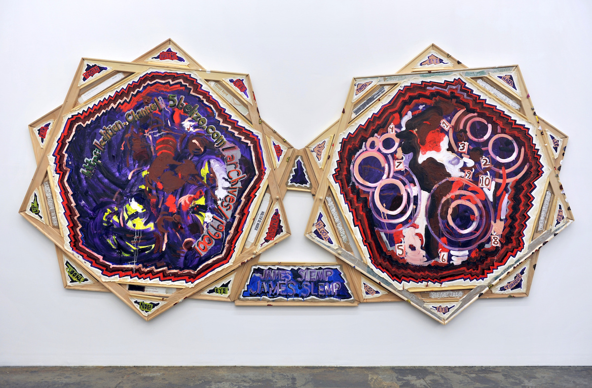 At Thomas Erben Gallery in Chelsea, Mike Cloud delved more fully into his hermeticism than either South or McNicholas, in service of directly addressing the act of mourning—the personal drift—through the vehicle of painting. His solo show formed an arcane language and classification system, a rigorous formula for pathos, that looks to cosmograms and Indigenous American Spirit Wheels for formalist answers. The shape of each canvas he makes—whether triangle, arrow, or octagon—represents a different genre of painting and a different vehicle for relaying information through paint. Triangles are portraits, specifically obituaries and monuments of mourning, and are depictions of people who have died by hanging. Cloud’s five pointed “Star of David” paintings are portrait and system paintings—in Shopping List Greener Pastures (2020), panels explore mundane color conundrums (green versus black tea, or green versus greener pasture). Cloud’s ideological approach to aesthetics has conviction, and his paintings recall Dutch still-lives in their non-hierarchical approach to seeing; that the whole world and everything in it needed to be painted, and in every combination. Cloud is thinking of the generosity that forms from hermetic vigilance, from an ideology that isn’t strategic, but felt and revealed slowly.