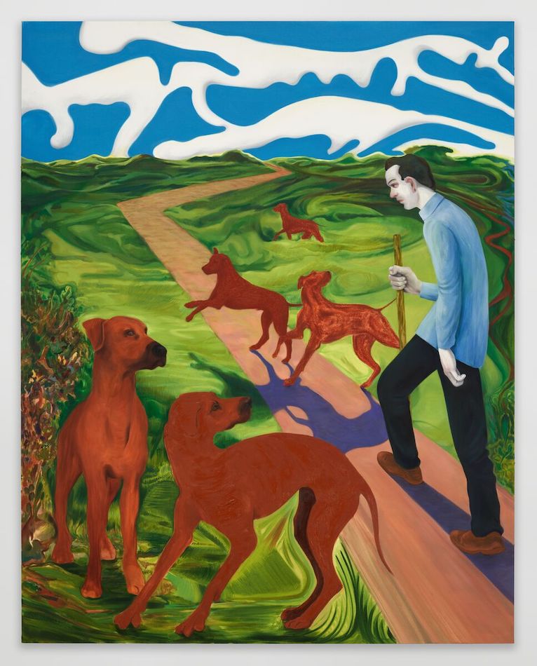 Stopa: Yeah. It sounds like you have found a structure on your own terms. That’s a nice segue into our last question. There are a handful of contemporary painters who make use of allegory and symbolism as a means to reckon with history. A few notable examples include Nicole Eisenman‘s Where I Was, It Shall Be at Hauser & Wirth, Salman Toor‘s How Will I Know at the Whitney and Projects 110: Michael Armitage at MoMA. There are also post-colonial issues in the work of Armitage and Toor. What about queerness in their paintings? Many of these figures, and their relationship to one another, appear fragmented. Our current hyper-mediated reality replaces an “authentic” experience of subjectivity and makes the private self a public self. Is the new “self” in painting one that no longer coheres to a logical, linear sense of place and time? What does this mean for authenticity and sincerity? Are we living in a post-ironic/post-sincere moment?