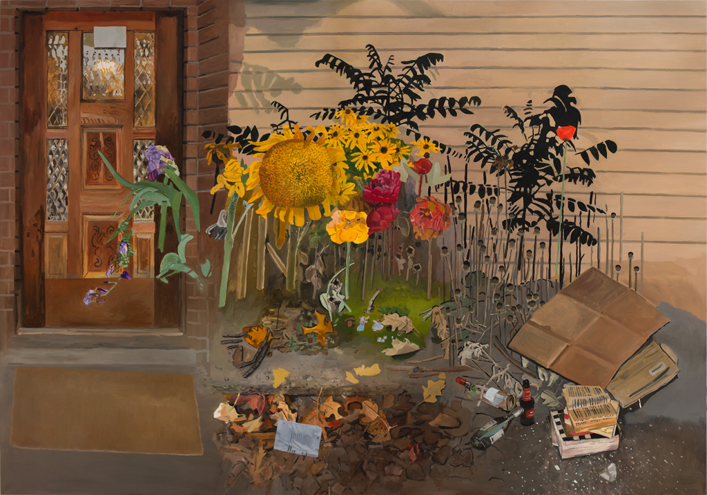 The most exciting, I think, is Front Door (2021), which shows a voluminous burst of bright, half-dead flowers in a patch of grass and garbage beside her front step, like spring and summer slumped together after a long winter. It’s as tender as I healed the little animals, but without the dream-like longing. Williamson’s relationship to the work is less ebullient than mine, however: she said she feels “like this person who’s watering their five small flowers and then they go back and do the dishes and go to sleep.”