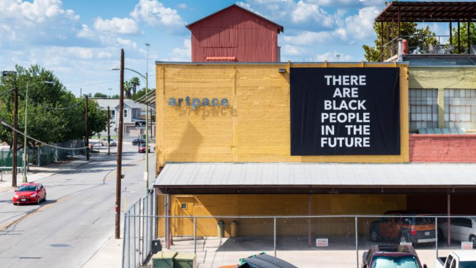 San Antonio hosts four of the biennial’s venues, a fifth is in Houston; all are located in institutional spaces. I began my biennial circuit downtown, where Alisha B. Wormsley’s banner reads THERE ARE BLACK PEOPLE IN THE FUTURE across the side of the Artpace building. A mile away, the San Antonio Museum of Art (SAMA) has given the biennial one of its more challenging spaces: its small contemporary gallery on the museum’s second floor is divided by four massive columns. One wall is truncated severely under a drop ceiling. Alongside Jackson’s video are works that utilize abstractions as politic. In Virginia Jaramillo’s Point Omega (1973-2018), for example, panels of red, maroon, purple, and violet are scored by two almost-parallel white lines; its title nods to its science-fictional referent, a utopian future in which all human consciousness merges.