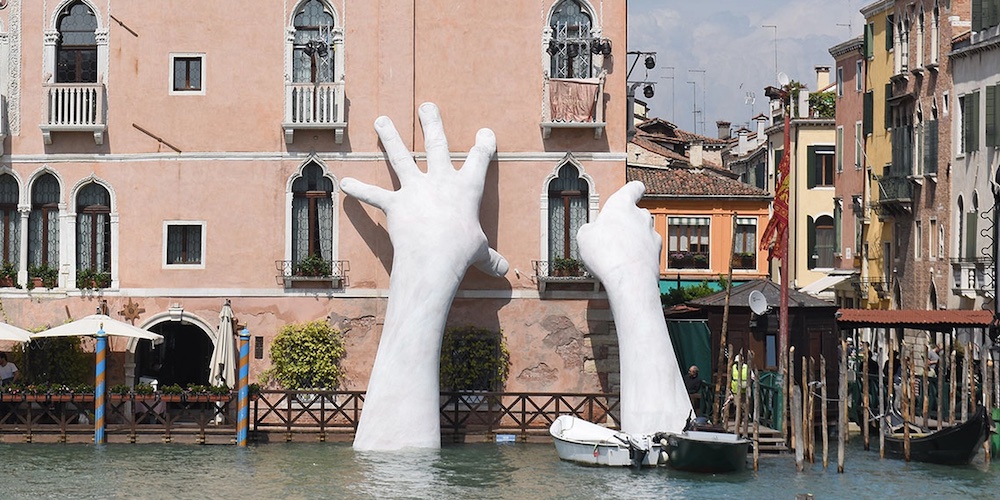 At the same time as the earth’s atmosphere grows more strange, giant anthropomorphic sculptures have been rising eerily out of the landscape. In the canals of Venice in 2017, a pair of large ceramic hands emerged from the water and pushed up against the side of a building. In 2010, the massive metal outline of a crouching man took up position on the coastline of the central Netherlands, facing contemplatively towards the sea. In Hong Kong in 1992, a human figure made of bamboo floated out of the Victoria Harbour, in a pose as if to walk across the ocean.