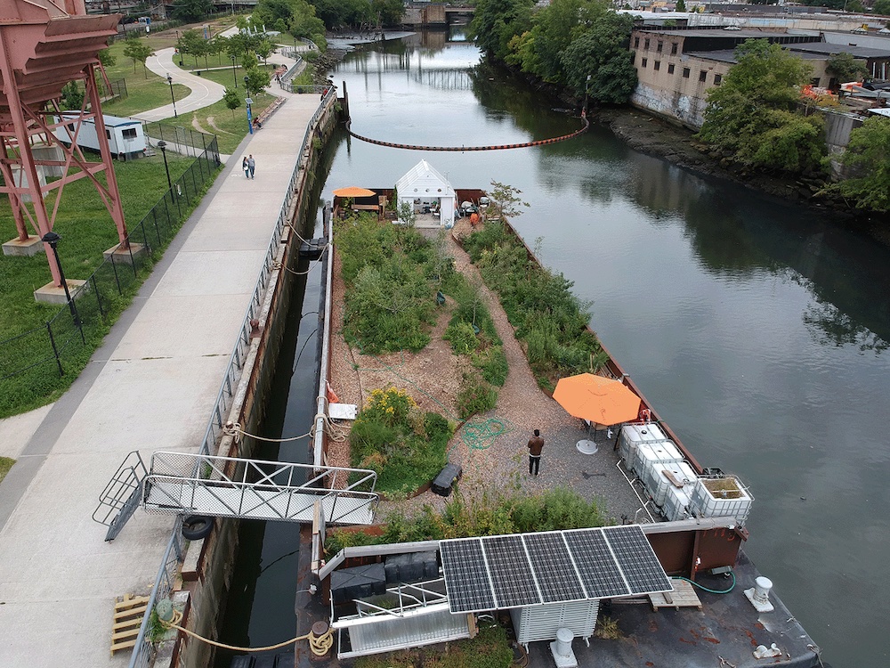 Up until recently, the barge had been docked at Governors Island (it’s now in a dry dock in Verplanck, NY, being repaired), and Mattingly noticed that saltwater spray was affecting some of the food plants around the edge of the barge but not others. She rearranged the plants so that the more resilient species formed a buffer around the edge of the barge. But then she started to wonder if those plants could survive on brackish water alone and set about to test the theory on the island. She plans to use the data she collects from these experiments for an expanded saline farming project in the future, on the Swale barge and in multiple locations on the New York waterfront. Her dream is that saline farming could be incorporated into plans to make the city storm resilient, providing both a buffer against storm surges and opportunities for access to freshly grown vegetables.