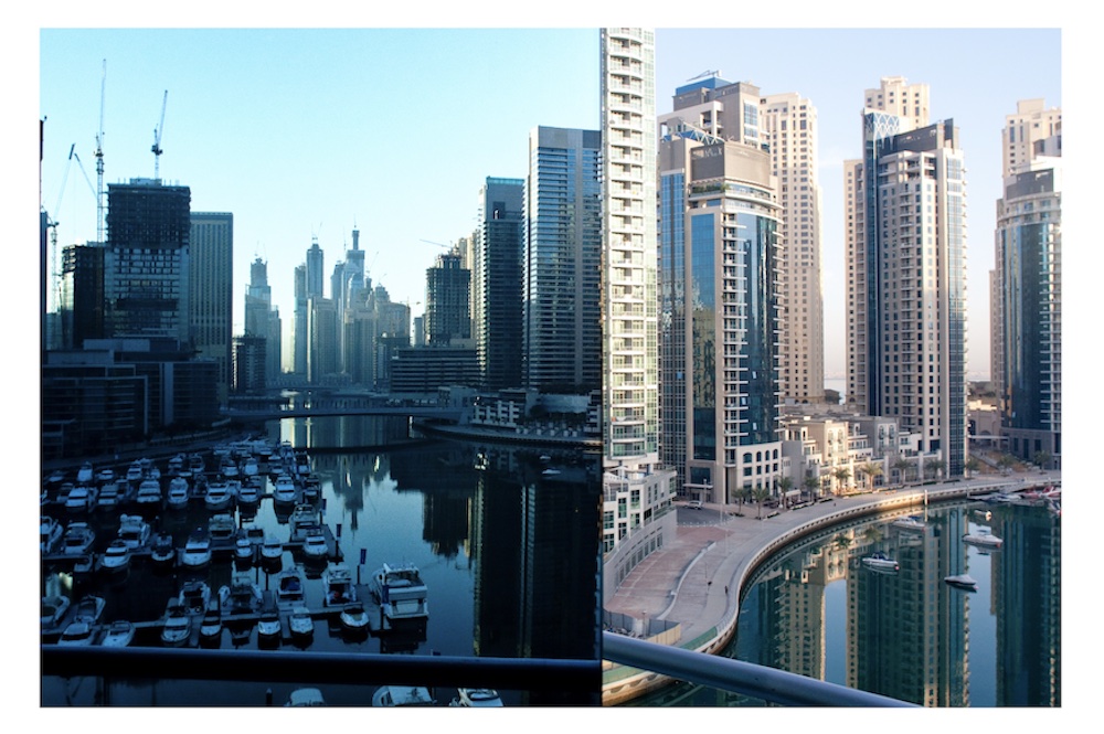 The horizontal catalogue opens with two images set side by side on the verso. As someone who has been privileged to call Vancouver home for almost twenty years, I instantly recognize the first image, an aerial shot of the False Creek marina taken over the wealthy neighborhood of Yaletown. Beside it is an image of Dubai Marina, which architecture critic Trevor Boddy describes in BC Business as “almost a perfect clone of downtown Vancouver—right down to the handrails on the seawall, the skinny condo towers on townhouse bases, all around a 100-per-cent artificial, full-scale version of False Creek filled with seawater from the Persian Gulf.”