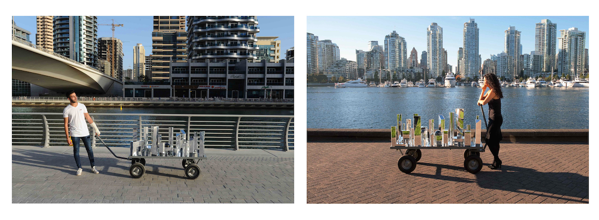 Maraya: Sisyphean Cart was one of the first Maraya artworks to expound on the mirrored flows of capital and the neoliberal structuring of space and social relations in the informally twinned cities of Vancouver and Dubai. Debuting in Dubai at the International Symposium for Electronic Art in 2014, two years after the marayaprojects.com website was launched, and arriving in 2015 at Vancouver’s edition of ISEA and 221A gallery, Sisyphean Cart was designed to be pulled along the seawall by residents and passersby. The low-lying cart resembled a long dolly and was equipped with a pan-tilt-zoom camera hidden among a series of “reflective mirror blocks made in the shape of recognizable landmark buildings in Dubai,” as Jim describes. When the cart is pulled, the upward-facing camera torques the skyline view into a street-view perspective. According to the project team, ‘The cart would invoke the spectre of labor—purposeful walking as a form of resistance to readily consumed images of idealized leisure—and the Sisyphean weight of this vision.’” One notable difference between the participants in the documentation photographs is that many of the cart-pullers in Vancouver appear to be dressed casually while out on a stroll, while those photographed in Dubai are in work clothes: construction gear, waiter’s uniforms, and business suits.