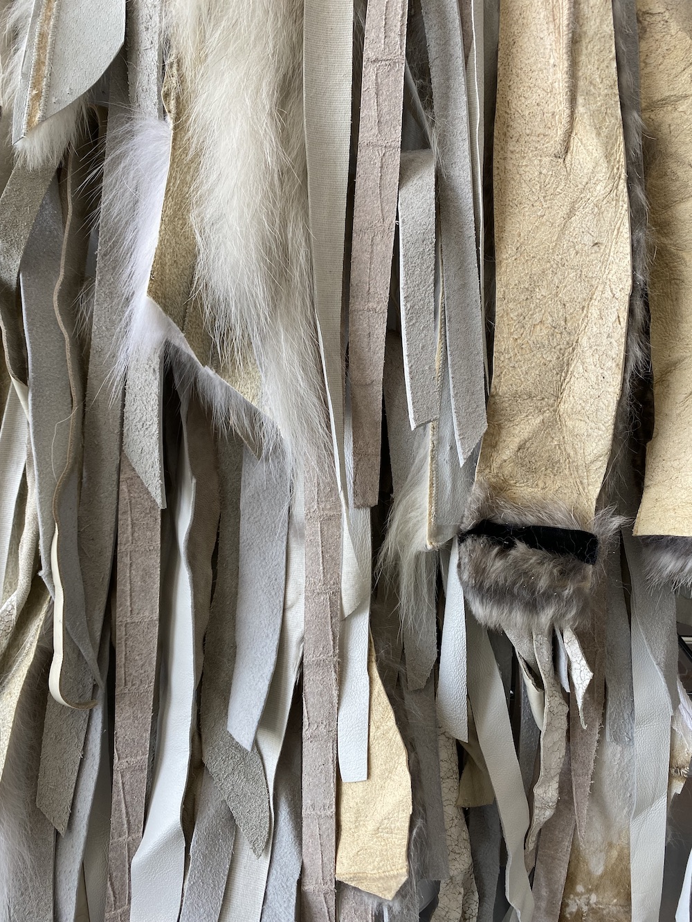 In the gallery, the creation of works of art from scraps of fabric that usually end up in the landfills of the post-colony invited viewers to imagine the often invisible labor of the millions of garment workers toiling in the fashion industry. The buildup in each sculpture of layers and layers of hand-sewn panels, ranging from inch-sized to several feet long—primarily in leather, fur, cotton, and nylon—invited viewers to imagine their own comparatively small-size bodies activating the six sculptures’ silent opera. As the dramaturge of this play reflecting on our multidimensional neocolonial present, I could hear Lewis asking: “How might we weave a world en masse after ripping apart and re-stitching this one, as a form of not only material reconfiguration, but also as a mode of spiritual renewal?”