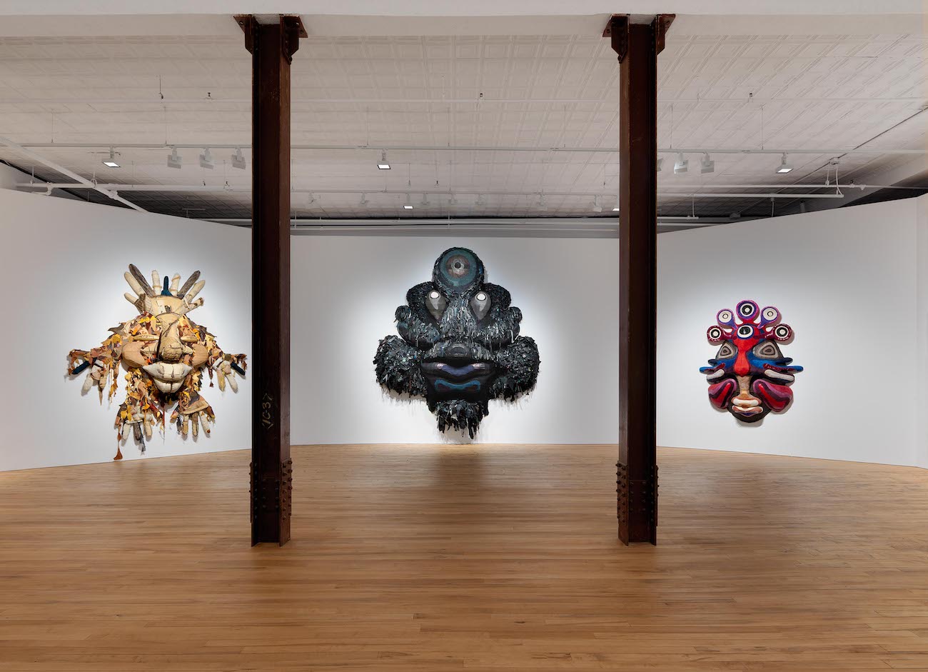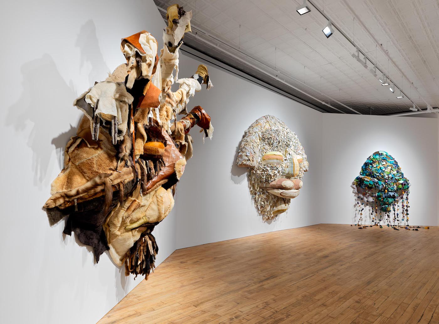 In Vox Populi, Vox Dei, Tau Lewis’s recent exhibition at 52 Walker, textiles and temporal forces worked together to unstitch and rethread imperial mythmaking. Lewis’s monumental sculptures, inspired by sci-fi, angelology, and ceremonial Yorubaland masks, were arranged in a circular stage to create a rounded theater in the style of the ancient Greek proscenium. Although the ancient Greek and Yoruba empires Lewis’s works invoked were contemporaneous, the empire that did not persist (with the rise of ancient Rome) is often the one imagined in the creation mythology of “the West” as the conqueror rather than the conquered. Lewis repurposes the already repurposed Latin phrase meaning “the voice of the people is the voice of god,” originally used symbolically to refer to the transfer of power from one empire to another. The phrase was later used by eighteenth-century British politicians as power shifted away from the monarchy with the rise of bourgeois capitalism fueled by colonialism. Lewis’s uptake of the phrase presses on toward de facto universal freedom by imagining that time when the voice of our creator is finally recognized, in truth, as the people’s voice.