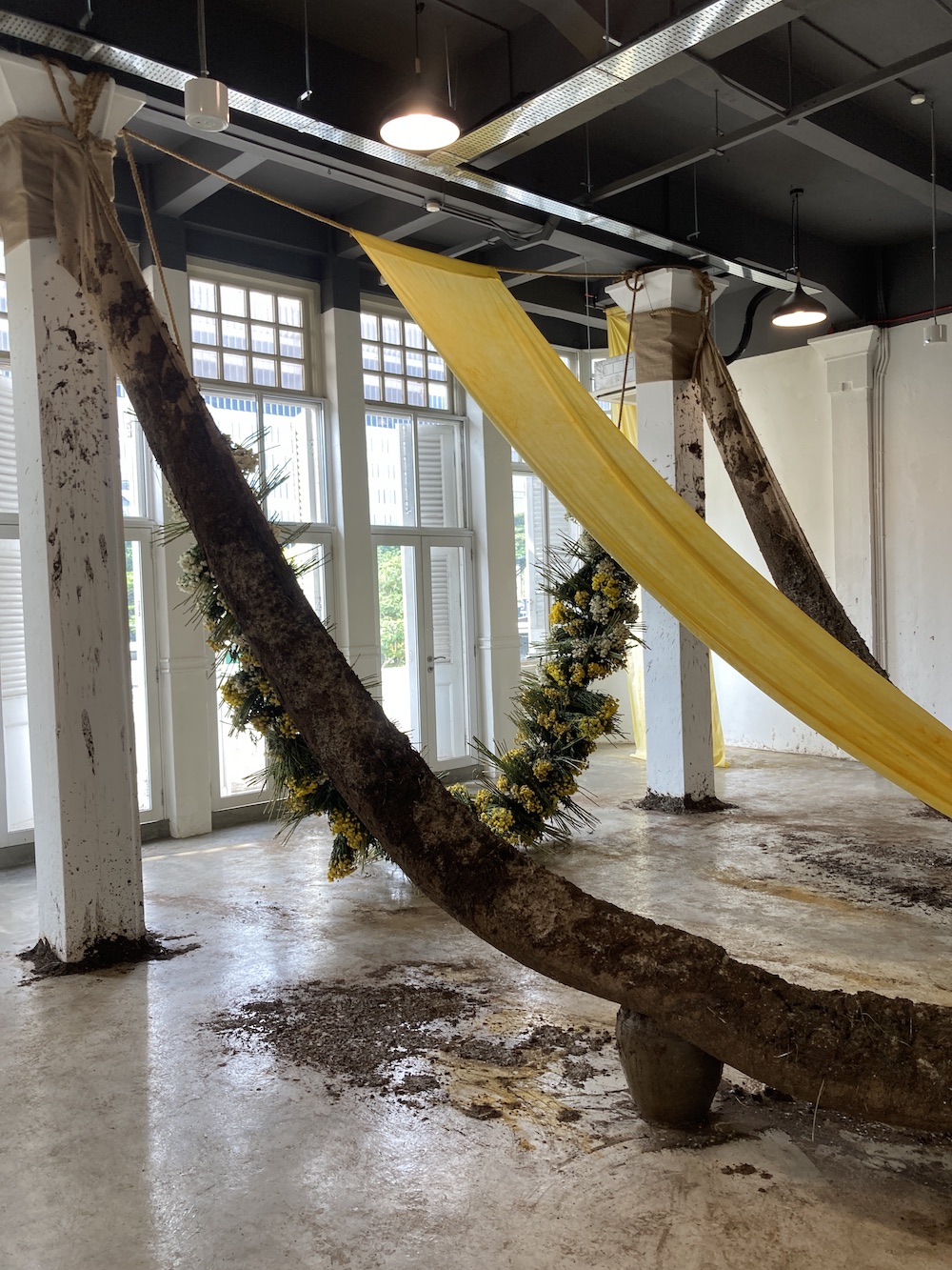 A glorious work that I have come to think of as the exact opposite of those little houses awaited on the second floor of a nondescript shophouse near the National Museum of Singapore. There, the Berlin-based Brazilian Indonesian artist Daniel Lie built an enchanting, room-spanning installation with huge bouquets of yellow and white chrysanthemums strung up toward the ceiling, turmeric-dyed cotton fabric, and masses of soil. Like the soy sauce, the installation changed slowly over time. It was intensely pungent, a site of both growth and decay (you could spot mold growing atop some of that soil). Its cryptic title, Fragility Game (2023), suggested that it could be the locus of some strange ritual. It looked like an ecosystem unto itself. On a wall label, Lie proposed that “we create an acquaintanceship, friendship and kindship with rottenness.” At a moment when so much is falling apart and wasting away, that sounded like an intriguing course of action. The frankly intoxicating smell inside Lie’s fertile piece proffered what is promised by—and so often missing from—so many of today’s safe, antiseptic biennials: the potential for wild new life.