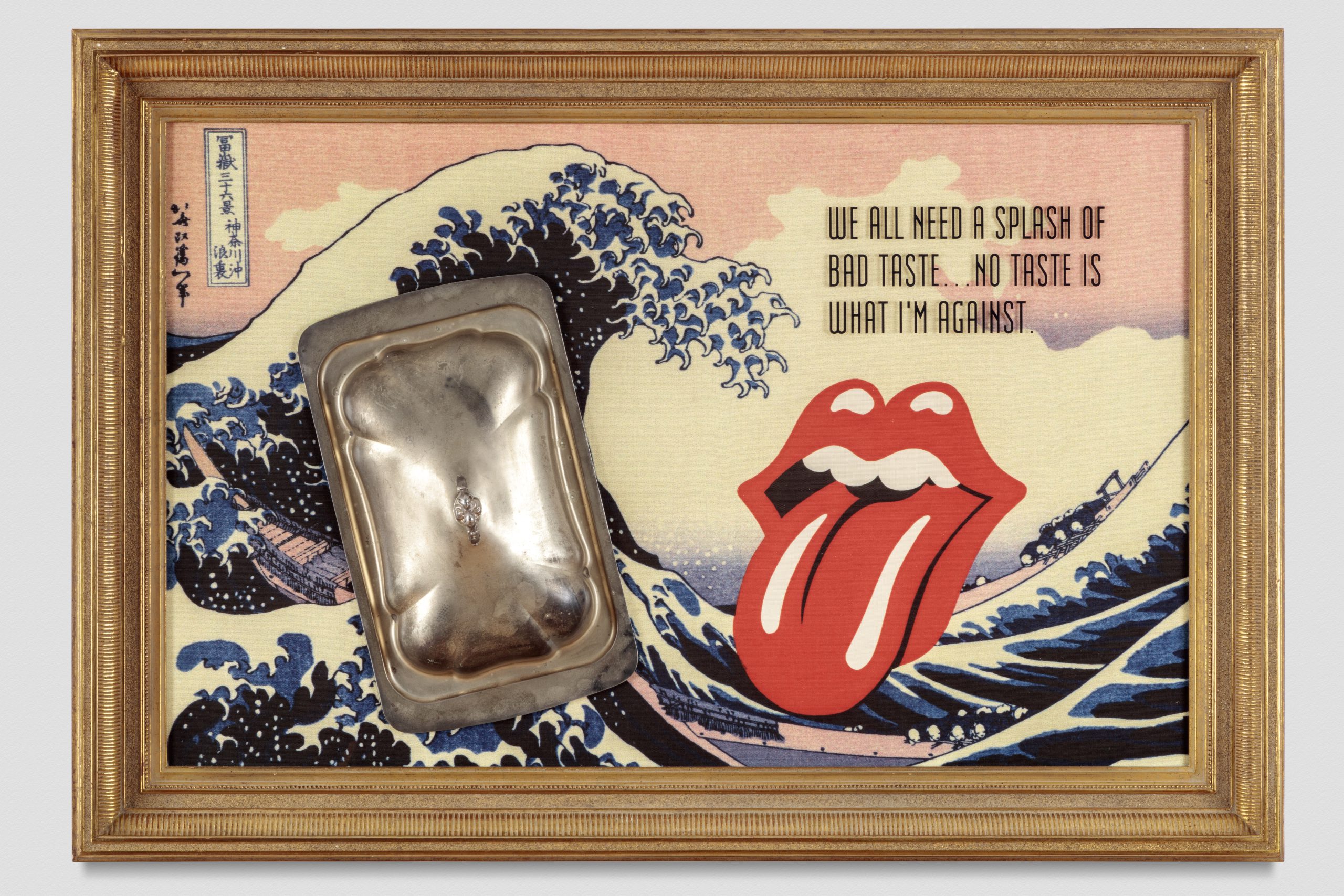 Satisfaction (2000) by the artist Alexis Smith is a collage that features a shabby reproduction of Hokusai’s The Great Wave placed within a glitzy gold frame. On one side of the canvas, the Rolling Stone’s ubiquitous cherry-red Hot Lips logo is reproduced over the print and, on the other, a sterling-silver plate cover is affixed. Above sits an unattributed quote (from the fashion editor Diana Vreeland’s 1984 autobiography) that reads: “We all need a splash of bad taste … no taste is what I’m against.” This piece is in many ways typical of Smith: the punning of the words splash and taste with the image of the wave, the tongue hanging out of the open mouth, and the plate cover; the permission given to the cliché and ersatz and the placement of these elements within a more gnomic, philosophical scope; the secondhand sentiment that seems at once universal, as well as particularly targeted toward American anxieties of worth, value, and discernment.