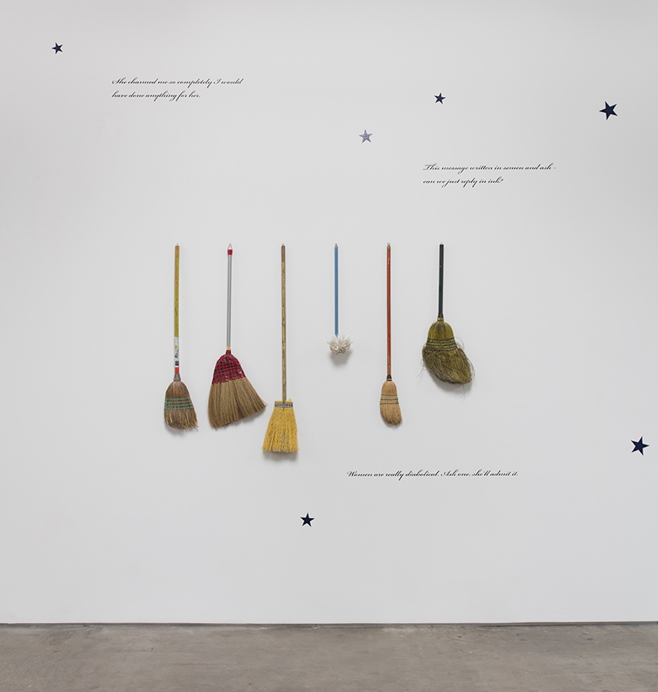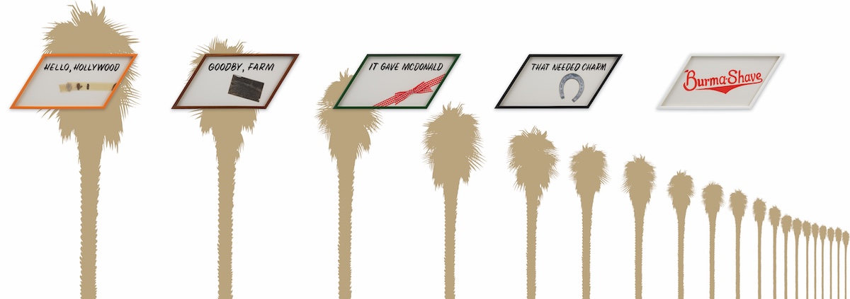 Others that recognized Smith’s impact as indelible spoke to the permission her formal construction, visual acumen, and sly wit gave them. The artist Marnie Weber, who is known for her uncanny and highly narrative sculptures and videos, studied with Smith at UCLA in the early 1980s. She wrote, “I wouldn’t have gone into collage without Alexis. Before I saw her work I wasn’t aware of the psychological expression that could be brought forth through the juxtaposing of images. Every piece holds drama, intrigue, and mystery. I really saw the theatricality in her work and it inspired me to think of my own collages as moments in a theatrical production.” The poet Amy Gerstler began to collaborate with Smith in the mid-1980s, eventually writing the texts that appear on the wall in the large-scale installations Past Lives (1989), which examined childhood, and The Sorcerer’s Apprentice (2000), a consideration of women’s work and the magical ideas that surround it. The two became close friends. Gerstler has poignant memories of the person Smith was, both strong and kind, and someone who practiced friendship as a true art. When she first saw Smith’s work, in a magazine, it made her think of poetry: “Her work was a watershed discovery for me. … [it] wasn’t afraid of squeezing meaning out of humble, quotidian materials pulled from cultural detritus. The work elevated these wildly varied materials (billboards, thrift store paintings, bullet casings, swizzle sticks, matchbooks, palm reader pamphlets, trophy antlers, girl scout badges, etc.) from junk into something complex, eloquent, magical, that talked about cults of fame and success, wanderlust, gender roles, myths, and fantasies about America.”