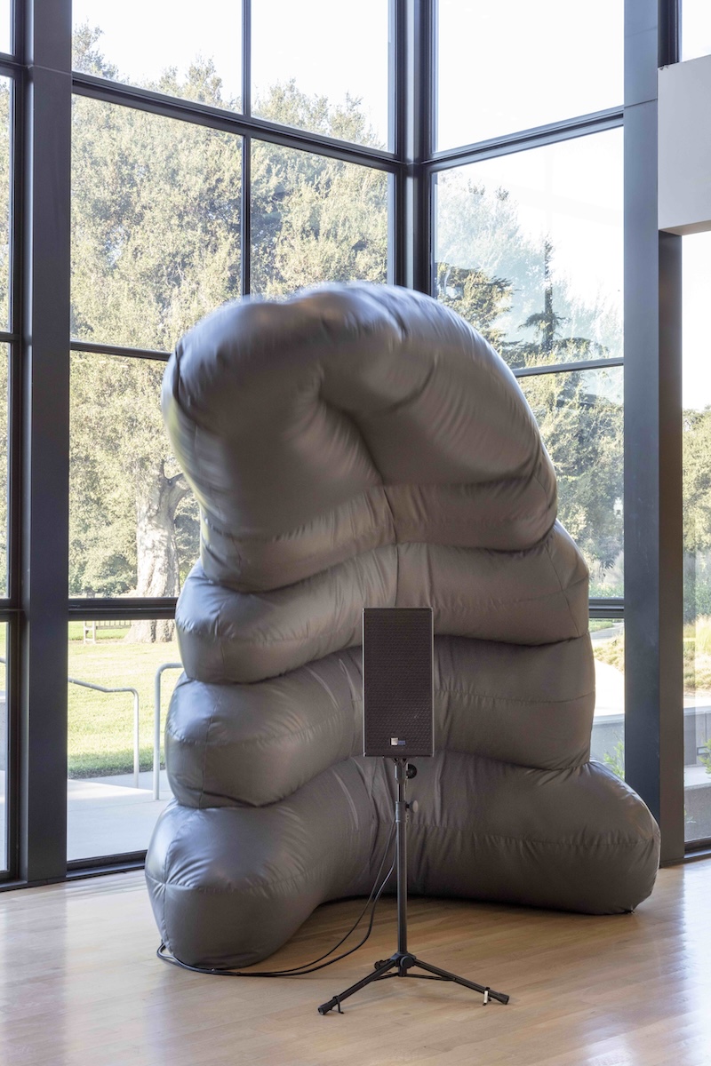 I don’t attempt to argue strictly for the implementation of spaces with flexible acoustics, but I do think that artworks and exhibitions that approach architecture as a source of sounding have the potential to destabilize conventions about how we move through and come together in museums. In her current solo exhibition at the Carpenter Center for the Visual Arts, Poems of Electronic Air, Jacqueline Kiyomi Gork recasts Le Corbusier’s Brutalist building through a cluster of wool and fiberglass columns that both mimic the center’s existing concrete columns and absorb its bass frequencies. The sculptures sit atop a bed of stones with contact microphones that visitors are encouraged to walk across, sending signals as they do into a live-feedback system that then amplifies the sounds back into the gallery. The artist is interested in the ways audiences change their behavior when they hear their movements reflected to them, plunging them into an intensified form of self-awareness with the sound of each crunching, pulsating footstep. While the work most overtly points to the performative aspects of spectatorship, listening to ourselves and to each other in this way can also unlock sociality and empathy. Kiyomi Gork offers a model to rethink the exhibition as a communal form of activity rather than a one-sided relationship between artwork and audience.