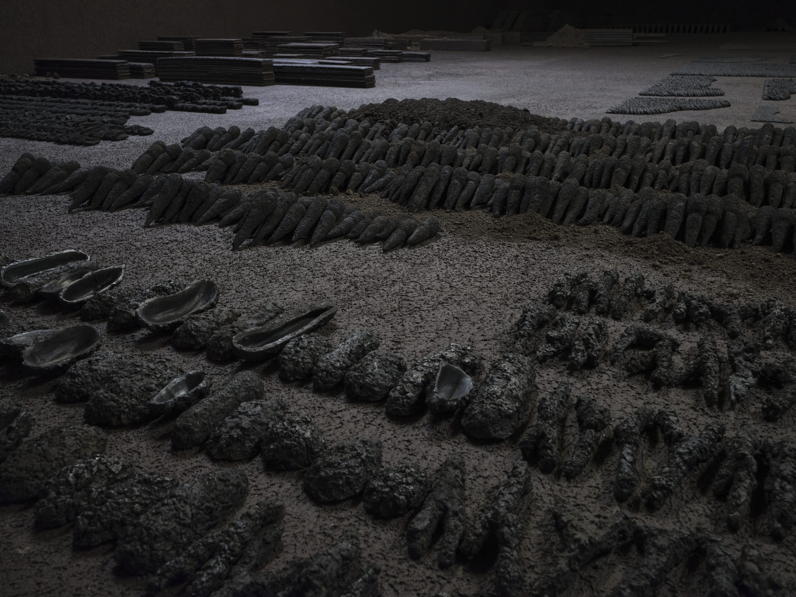 In Cielo terrenal, a mélange of interwoven elements introduces gestures of dispersion; an accompaniment to El abrazo’s embrace. Low light drapes the scene in darkness, creating a perpetual feeling of dawn or dusk. Nearly disappearing into the twilight, an opaque layer of textured mud spreads across the floor and creeps up the walls, creating a tideline that encircles the perimeter of the room (this line corresponds to Hurricane Sandy’s high-water mark, gesturing toward both past and future environmental catastrophes). A narrow pathway cuts into the surrounding monochromatic landscape, which is dotted with abstract accumulations of sculpted forms (all either shaped by or encased in soil): planks, bricks, cellular-like clumps of clay, vessels resembling seedpods or mummified bodies, pipes and tubes, orbs and pellets, and other amorphous, handwrought shapes, several of which are interspersed with pebbly piles of dirt. Like distinctive life-forms fertilized by seeds scattered in the wind (or by plentiful globs of dung, as some tiny sculptures here insinuate), these dispersed materials appear to have sprouted from the earth that surrounds them. The resulting panorama oscillates between the cartographic and microscopic, at once resembling an aerial landscape or immense burial site and a magnified view of sliced tissue. The darkened space also suggests a subterranean cavern—an amniotic chamber of sorts, tucked into the body of the earth—replete with a covert, thriving ecosystem. Here, multitudinous objects cohere into a single interwoven universe, which folds together haptic references to both our inner and outer worlds. If colonial models of extraction inherently rely on duality and separation, a tearing away of one thing from another, Cielo terrenal rejects the concrete dualisms and binaries of human versus nature and self versus other, suggesting that these categories remain intrinsically porous and intertwined, and thus fundamentally inextricable from one another.
