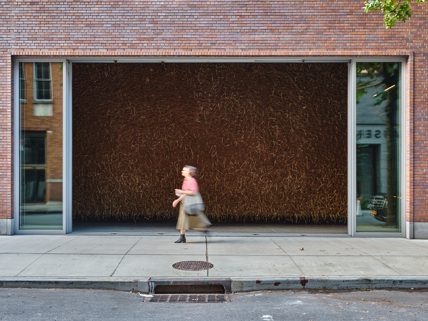 Over the course of her thirty-year career, Morelos has been deeply informed by the mythologies and practices of Indigenous groups from the Colombian Andes and Amazon (such as the Uitoto, indigenous to southern Colombia). Her earth-hewn sculptural installations reflect the distinct Uitotoan cosmovision that, as Morelos writes in the forthcoming catalogue, “the universe ‘is a basket in which everything that exists is woven.’” El abrazo enacts this philosophy of interwovenness by explicitly tethering the body to, and infusing it with, the earth. A massive, heaping mound of soil peppered with intermittent stalks of grass, the earthwork’s loose pyramidal shape recalls ancient ziggurats, burial mounds, and earthen adobes, pointing to the myriad ways in which mud has functioned as a material for cradling, entombing, and housing the human form, both dead and alive. At the same time, the work’s economy of materials and concise visual composition directly nods to languages of sculptural abstraction, a consistent quality of Morelos’s work and a reminder that, even as she undermines the colonial logic of the Western canon, its aesthetic tropes nonetheless inform her practice.