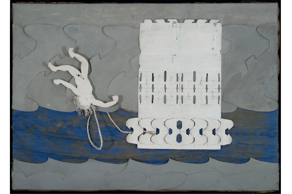 Does chaos drift? It wouldn’t seem to, and yet. In Untitled (The Drifting Tower), ca. 1950, a cut-paper and mixed media collage, a floating figure, her groin literally pinned, is tethered by rope to a kaleidoscopic fortress amid waves and clouds. Which is the anchor? “Or which of us,” to quote from Loy’s 1917 poem “Human Cylinders,”