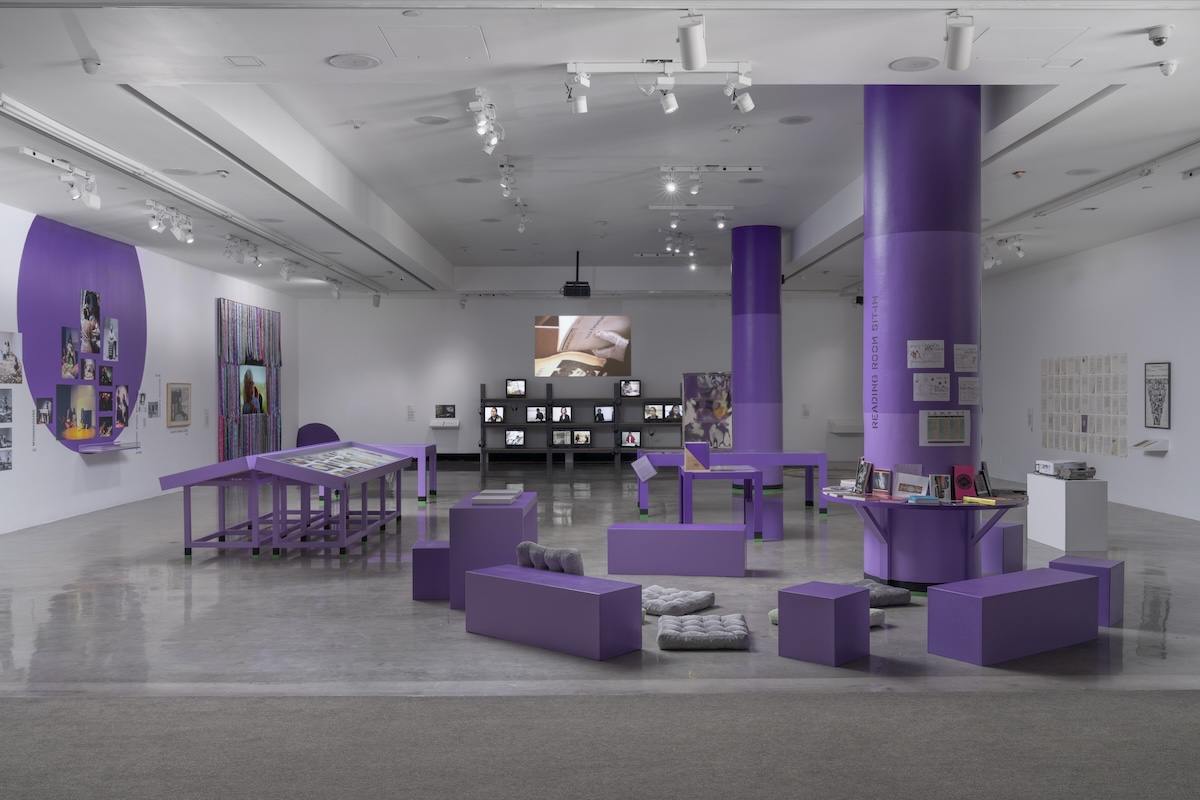 One of the most telling inclusions in Cycles of Collectivity was a research project by artist Ekta Aggarwal documenting who has taught courses at CalArts from a feminist perspective since the FAP’s 1975 closure. Aggarwal assembled a spreadsheet of feminist courses and feminist faculty, and also collected syllabi, course descriptions, and email correspondence. These are printed on multicolored pages and organized into folders, which visitors to the show could thumb through while sitting on purple stools. These folders are noticeably unofficial, collected by Aggarwal mostly from individual instructors rather than from institutional records. Some former faculty provide paragraph-length first-person accounts of their courses; others provide multipage syllabi. As the context for these courses, CalArts feels distant—less important than the strategies that these individual educators employed to introduce their students to more open, divergent perspectives on power and how our subjectivity influences art-making. Only three female faculty members are listed as teaching feminist courses between 1975 and 1980: Jo Ann Callis, Judy Fiskin, and Lynda Benglis. Five are listed between 1981 and 1990. The columns from 1991 onward become more populated and increasingly expand to include more instructors of color as well as queer and trans artists. But the early dearth remains striking. It mirrors a larger cultural backlash against the progressive values that flourished in the late 1960s and also helps explain why students who passed through CalArts in the 1990s and 2000s had to work to rediscover the FAP’s history for themselves.