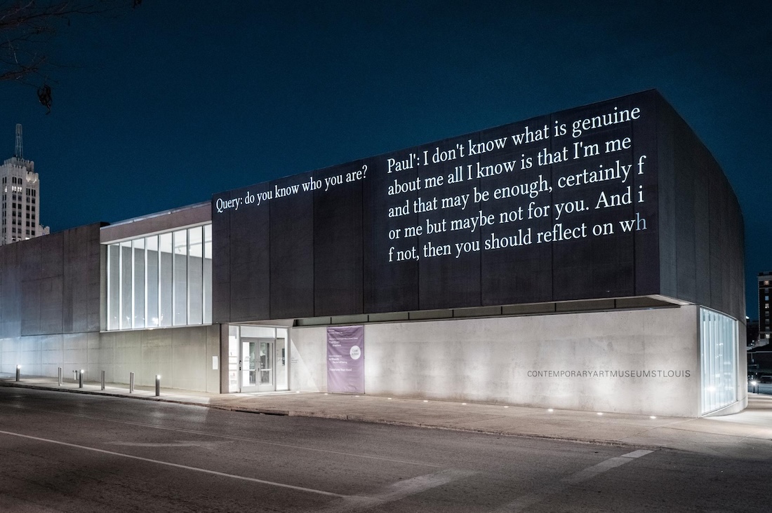 Elsewhere, the exhibition’s lack of legibility manifests most distinctly in Paul‘ V.4.3, projected on the museum’s facade. At night, questions in white text appear typed on a facsimile of a computer screen, such as “What do you consider the most overrated virtue?” and “Why is Bathers an important work?” Paul’ V.4.3 then types a response to each one. Watching the projection from the sidewalk across the street is like witnessing an internet chat in real time, each letter of each word clicking into place as code whirls behind the screen.