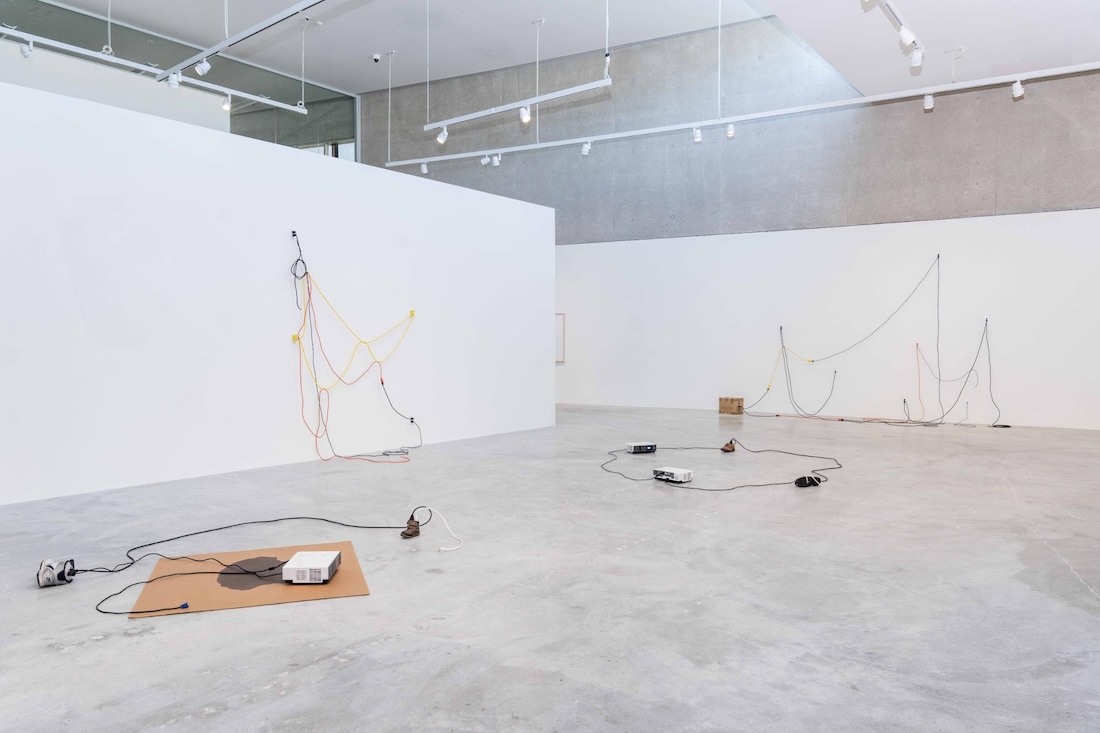 In adjoining galleries, two abstract series, Arguments and Nonprojections (both 2012–13), include materials like shoes, cardboard, electrical outlets, and wires. Chan filled the shoes with concrete, taped the outlets shut, and left the wires flaccid. The winding gallery space enables viewers to parse through each installation as a different period in Chan’s recent oeuvre and move back and forth in time. Arguments and Nonprojections are the only indoor installations in which “screens” appear. These are formed by the outlines of wires that frame sections of white gallery walls or that connect empty projectors aimed haphazardly at nothing in particular. These are screens that break down, misfire, and show us nothing, just absence.