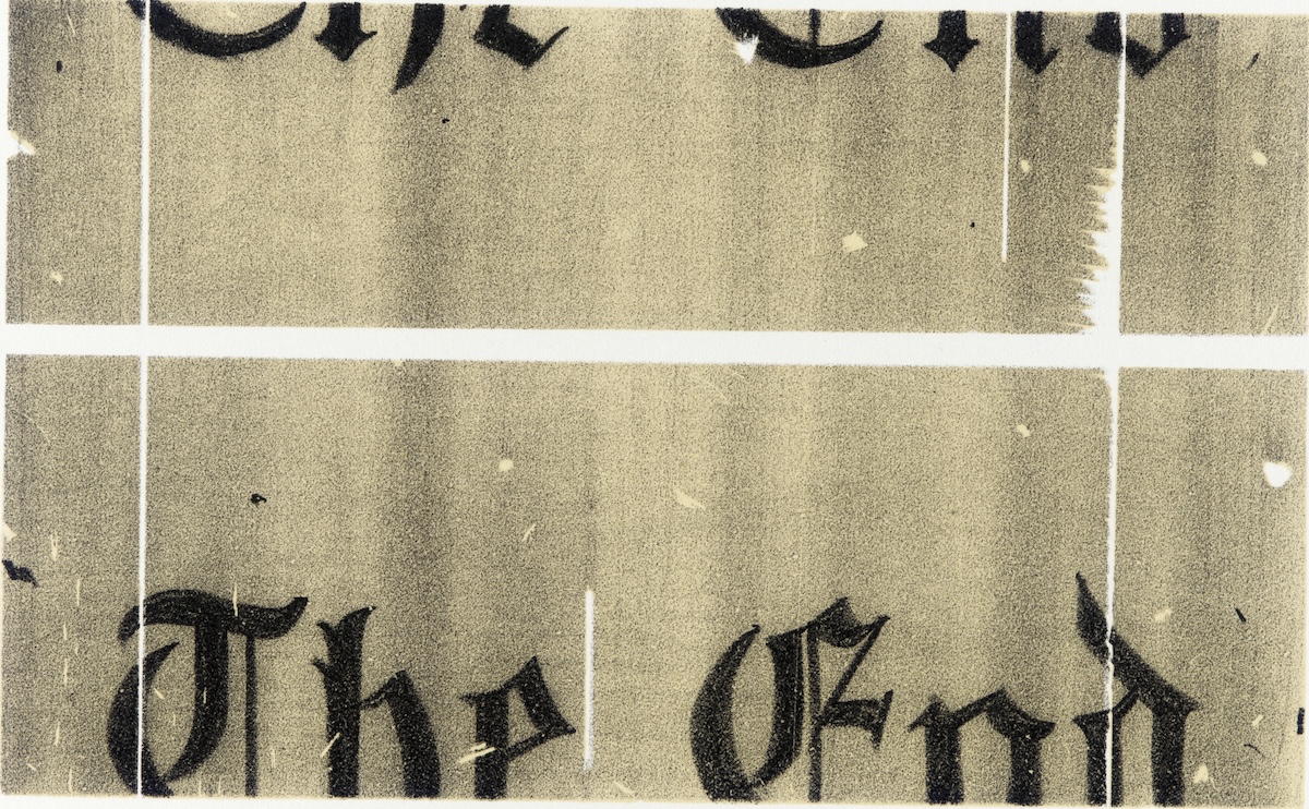 Roughly the latter half of NOW THEN descends into a thematic darkness that can be read as a more open critique of American empire (called out by name in the 1992–2005 suite Course of Empire), even if Ruscha himself might decline to say so out loud. Ranging from his moody, fuzzy silhouette paintings to explicit considerations of time, as in the clock faces of Five Past Eleven (1989) and Clock (1994), the proposition embedded within The End (1991), or the globalization focus of Course of Empire, these works have a decidedly heavy, existential bent. Still, amid even his most forthrightly grave works, Ruscha literally makes space for a different story by toying with text redaction as a multivalent tool. Two specific examples stand out. The 1996 painting Note We Have Already Got Rid of Several Like You—One Was Found in River Just Recently uses black redaction blocks to “erase” a death threat sent to the baseball player Jackie Robinson. While Ruscha could be personally condemning the threat’s content by “covering” it up, the text itself, from which the title is drawn, is the key to understanding the work. As ever, Ruscha is questioning the power of words in relation to power itself, here more explicitly in terms of American white supremacy. The earlier 1987 canvas Mother’s Boys, which hangs one gallery over, also bears a redaction-like mark: a large white rectangle placed like a caption beneath a shiny and billowing American flag. The patriotic representation immediately conjures the proud, if vague, memorialization used for those who have died “for the flag.” Maybe the white box is there to tell us what the flag could mean: a literal blank canvas for writing another narrative where mothers’ boys aren’t forced or conned into dying to kill other mothers’ boys in perpetuity.