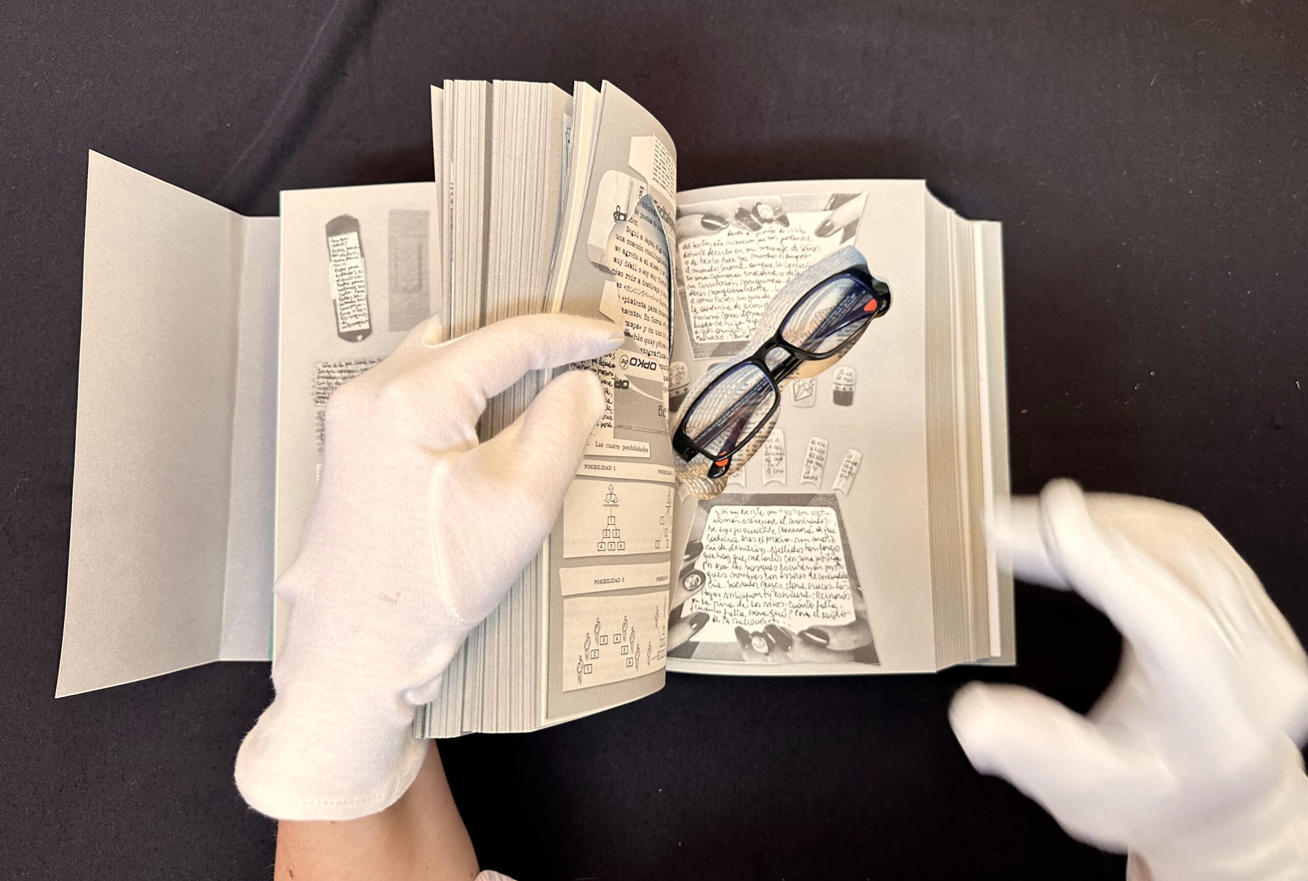 The poet often worked alone as the book came to life, writing, gluing all the print material, cutting the eraser, and so on. But sometimes he invited friends and colleagues from different parts of the world to participate in his adventure: England, China, and the south of Chile, where he lives and works. Some collaborators gathered with González Cangas in intimate writing sessions. The making became a collective enterprise, which created a special timeline for the book—free from the demands of institutions and publishers—by inhabiting a playfulness in a creation process that spanned more than a decade.