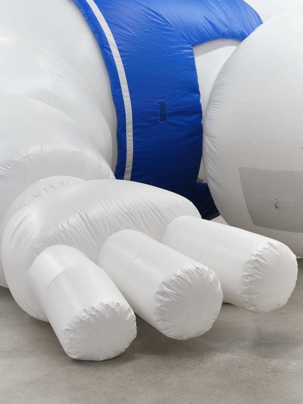 We’re Ready to Believe You! (2024), for example, is an arch reassemblage of the violence of whiteness. Splayed across the gallery floor, a thirteen-foot inflatable version of the Stay-Puft Marshmallow Man, a humanoid character composed of stacks of spongy confections, seems to have toppled from a great height. Its right arm reaches out in desperation, while its face is plastered to the floor, unseen. I kept circling its unwieldy form, and at times my body felt enmeshed with the suspended white nylon. In the 1984 Ghostbusters film, this marshmallow logo reappears in the film’s climax as the final paranormal monster, a physical manifestation of an apocalyptic deity. We’re Ready to Believe You! obliquely confronts this imperial logic, imagining a slapstick fantasy where this manifestation of whiteness falls flat on its face. As with most of her titles, the text provides a mordant punchline, recalling the ways that these traumas are dismissed as figments of brown and Black people’s imagination.