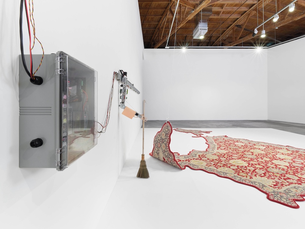 When I arrived at Night Gallery in Los Angeles and entered the first room of Divya Mehra’s exhibition, The End of You, the arm had begun a slow, agonizing journey across the rail. It was wired to do one action, seemingly without end, and that is to sweep under the rug. Once near the uprooted textile, the arm lurches with life to wobbly clean the shadowy space between it and the textile for a few seconds, before returning to its neutral state and retreating along the rail. Upon first glance, I had an impulse to laugh at the dry absurdity of this piece, titled You’re Doing The Work (Diamond Jubilee) (2024). But on further examination, the parenthetical aside in the title brought to mind the 1897 Diamond Jubilee of Queen Victoria, who was monarch during the first forty-three years of British imperial rule in India. During this period, British colonizers reenergized the Indian carpet industry, fueling the demand for ornate, handwoven rugs in Britain. To satisfy this inflated need, the British Raj began exploiting the labor of Indian prisoners. In 1877, people incarcerated in the Agra prison wove what was believed at the time to be the largest seamless rug, which was presented as a gift to Queen Victoria for her Golden Jubilee, when she became the “Empress” of India. The pageantry of this milestone, and the violence of British presence in general, is undercut by this skit between the arm and the rug. Slyly, Mehra reiterates how the Partition of India was a consequence of British imperial rule, whose policies encouraged antagonism and divisions along religious lines that still reverberate today. Britain has yet to take accountability for its role, and instead seems to have washed its hands of the matter.