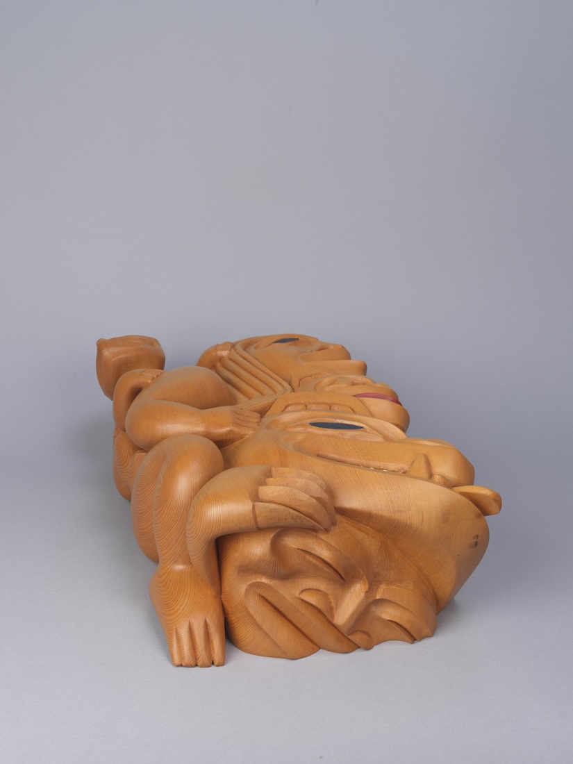 When Bob left the cannery, he sought out the tutelage of the Haida artist Freda Diesing, leading to what became a formative relationship. At the time, many young artists refused to work with Diesing because, according to traditional gender roles, women were not supposed to carve. But Bob recognized in her the meaningful change his people needed to move forward and revive their artistic practices. One glance at any sculpture in Bob’s extensive body of work reveals the deftness with which he carves away at the wood to find the story within.