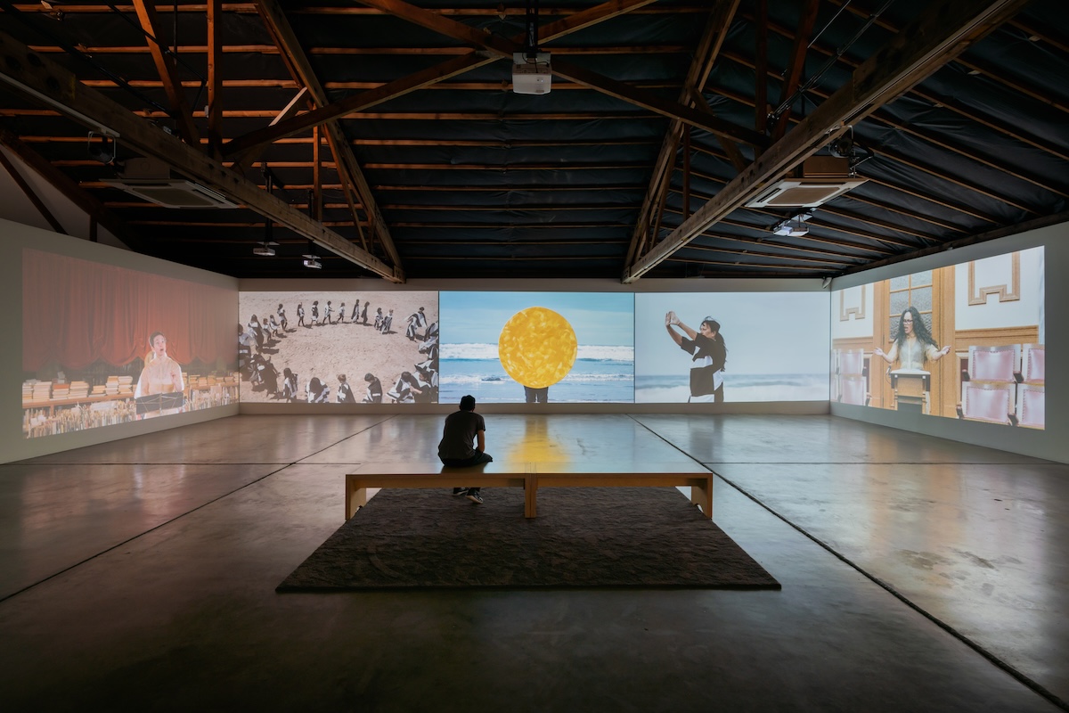 In this work, multiple timelines mingle across a row of five screens for twenty minutes that seem to stretch and compress. Two performers stand at podiums—Andrews, in a Portland library, and Mere Tokorahi Boynton, in the New Zealand Parliament Building—and sing a libretto of the proposed resolution in English and te reo Māori. Their voices sound out amid a droning soundtrack of pump organs, not quite in harmony but falling into a consonant pace. Between these institutional sites of history-keeping and -making unfolds hushed footage, scripted and staged by Hamilton, of cycles and currents: an intergenerational choir circling on a Pacific Coast beach; a person slowly spinning a gleaming, golden disk evoking the sun; a mother and daughter kneeling outdoors, holding up seashells and guiding them in circular motions, with the timekeeping Royal Observatory in Greenwich visible in the distance.