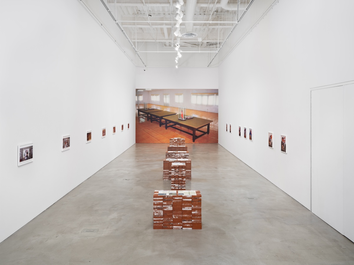 KISSSSS occupied the gallery’s main space, positioned so that upon entry, a viewer faces seven low brick “stations” laid out in single file, from the front to the back of the room. Each of the stations, arranged in chronological order, represented an event during the Korean War, beginning when the US military established the 38th parallel dividing North and South Korea at the end of World War II in 1945, and leading up to the signing of the Korean Armistice Agreement in 1953, still in effect to this day. Min’s photographs of lovers kissing hang on the walls to the right and the left, with each photograph to the left aligning with a station and its historical moment. The exhibition’s curator, Bridget R. Cooks—Min’s friend and colleague at UC Irvine—decided to include materials on each station showing Min’s research. There were scans of pages from books on the Korean War marked with Min’s annotations, archival images, maps, and email correspondence between Min and her researcher, the artist C. Ryu. Walking from station to station and taking in all the information Min gathered had its intended effect, insofar as it insisted on the work’s incompletion, and the challenge that the duration of the Cold War presented to Min’s artistic practice.