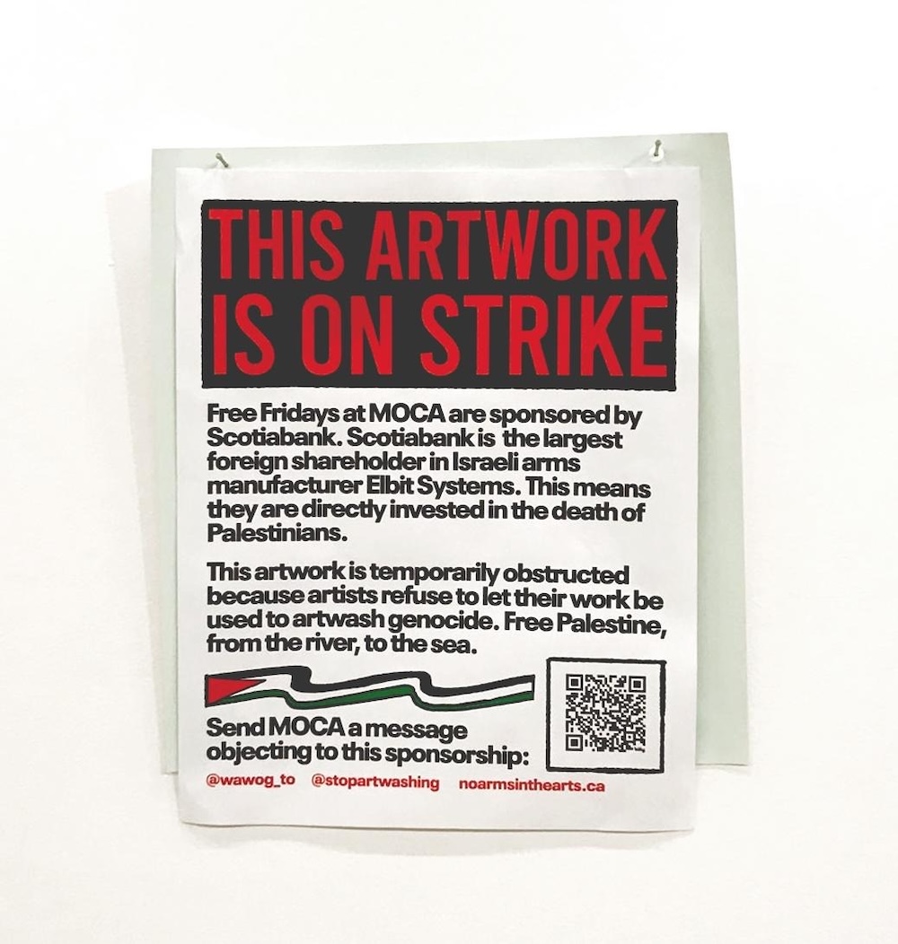An October 2024 report, “Surveilled & Silenced: A Report on Palestine Solidarity at York University,” documents before-and-after images of a student art installation at the university where I work, which critiqued the administration’s business-as-usual posture during a genocide. The installation consisted of various posters and protest images pasted on doors in the Faculty of Environmental and Urban Change. One of the larger posters initially read, in the colors of the Palestine flag: “Anyone else struggling with work genocide balance?” Like the ROM exhibition, it was then censored and removed in December 2023. Across Toronto, just in the last few months, there have been film screenings raising funds for Gaza’s food systems, a DJs Against Apartheid campaign to boycott Porsche Scopes Toronto, free book clubs with writers who have, in solidarity with Palestine, withdrawn from the Giller Prize, whose lead funder was Scotiabank until fifteen months of protests and boycotts led the Giller Foundation to end its partnership with the bank in February 2025. While the three curators that I opened this essay with are no longer attached to the same institutions, their work continues, since it was never the institution that nurtured their most important projects—Nanibush, for example, recently held the 2024 edition of aabaakwad, an annual Indigenous-led convening on Indigenous art and artists. Artists, too, are an especially precarious group, and the brazenness of the normalization of Zionism has resulted in vulnerable culture workers risking their livelihoods to stand with Palestine. Over the summer, in protest of MOCA’s financial relationship with Scotiabank, the artist Sukaina Kubba obstructed her own Persian textile–inspired sculptural wall drawings at MOCA’s GTA24 Triennial with a sign that said “THIS ARTWORK IS ON STRIKE.” Other efforts that are autonomous, in common, and perhaps more transformative than anything on a wall are still emerging. The horizon has yet to be formed.